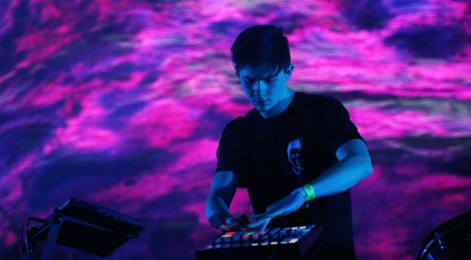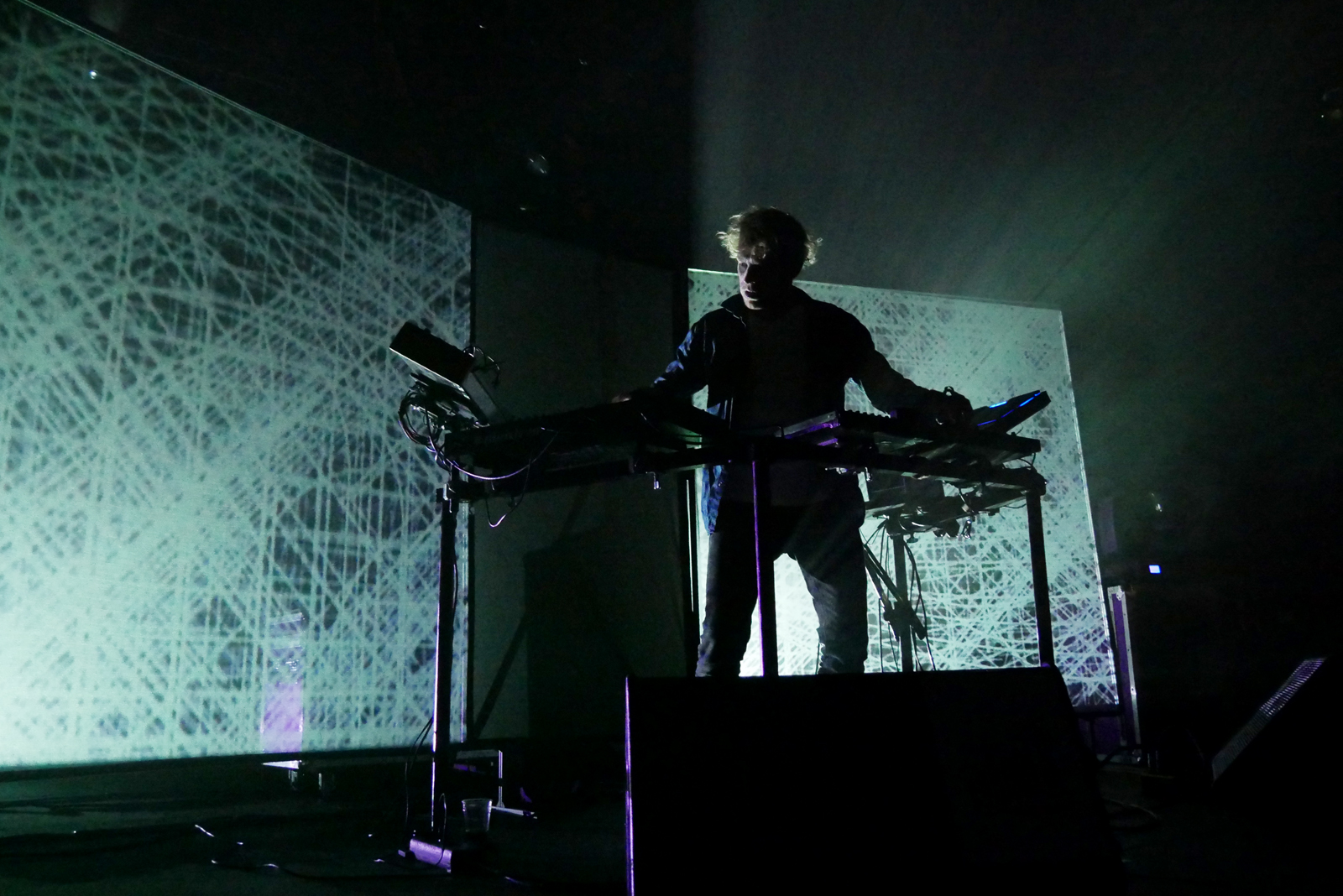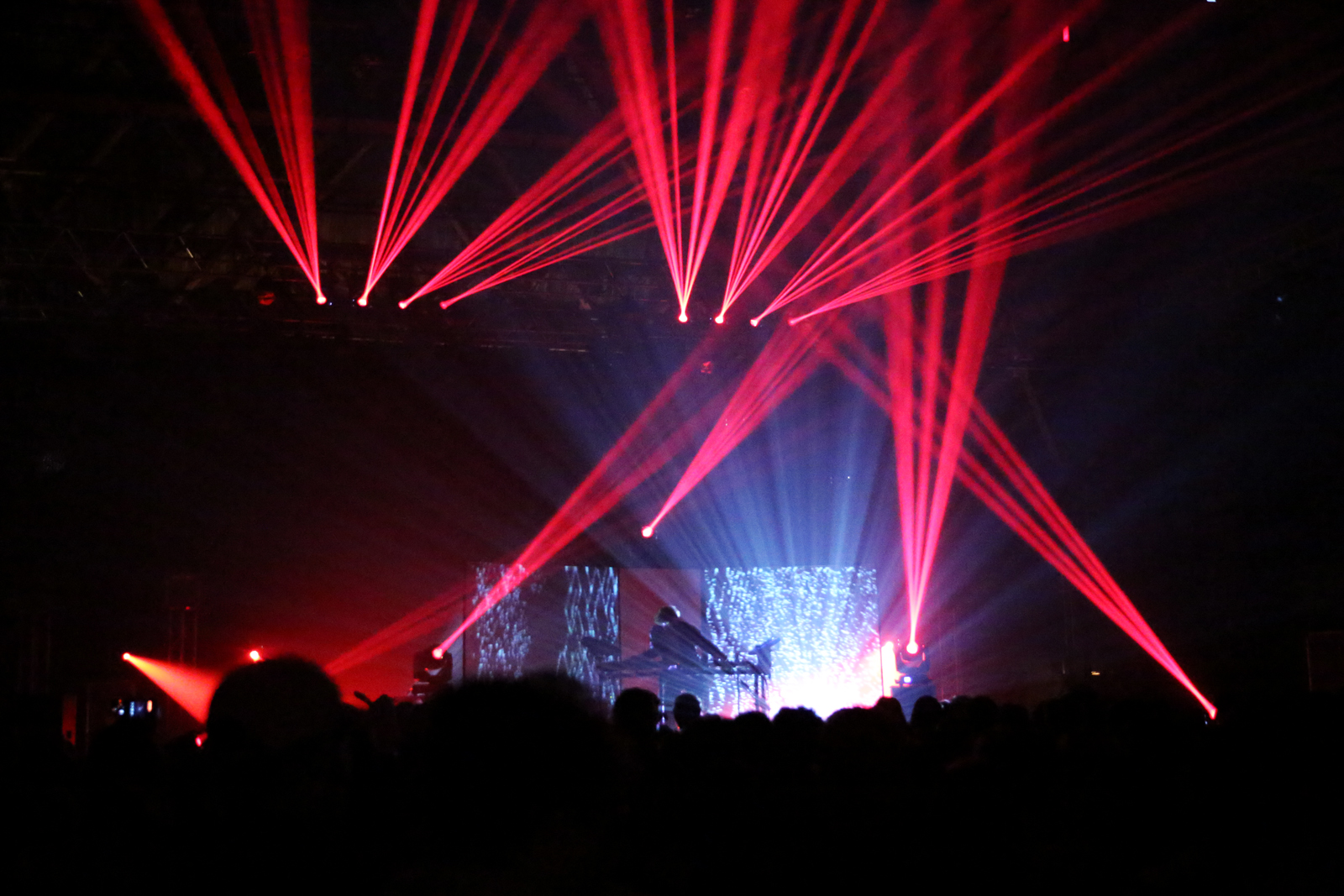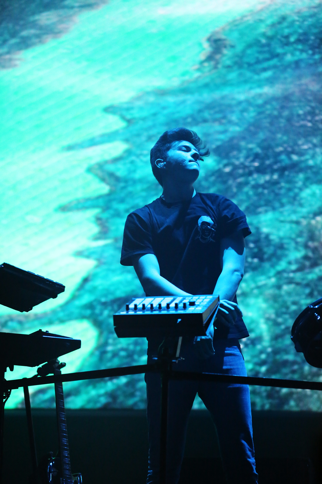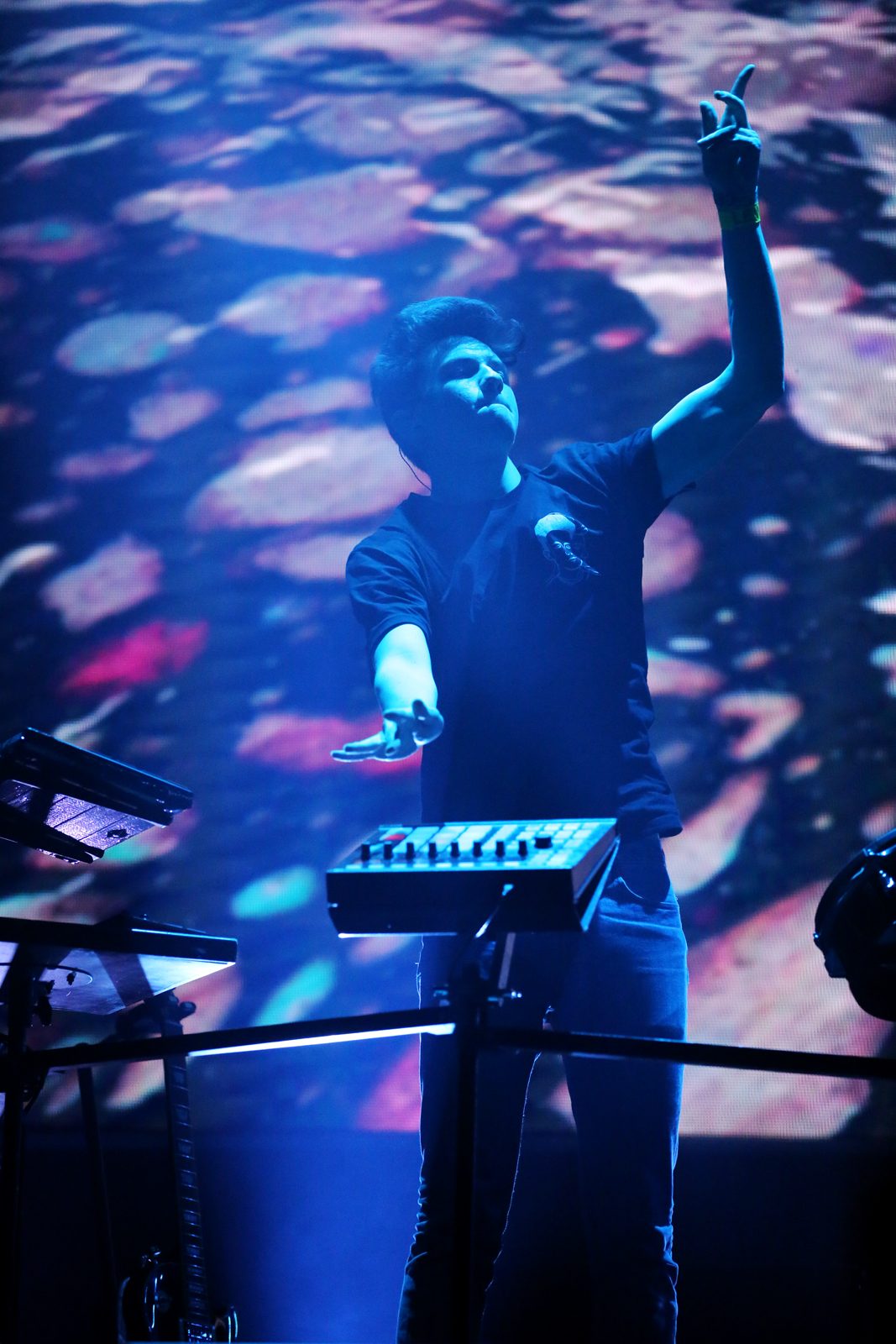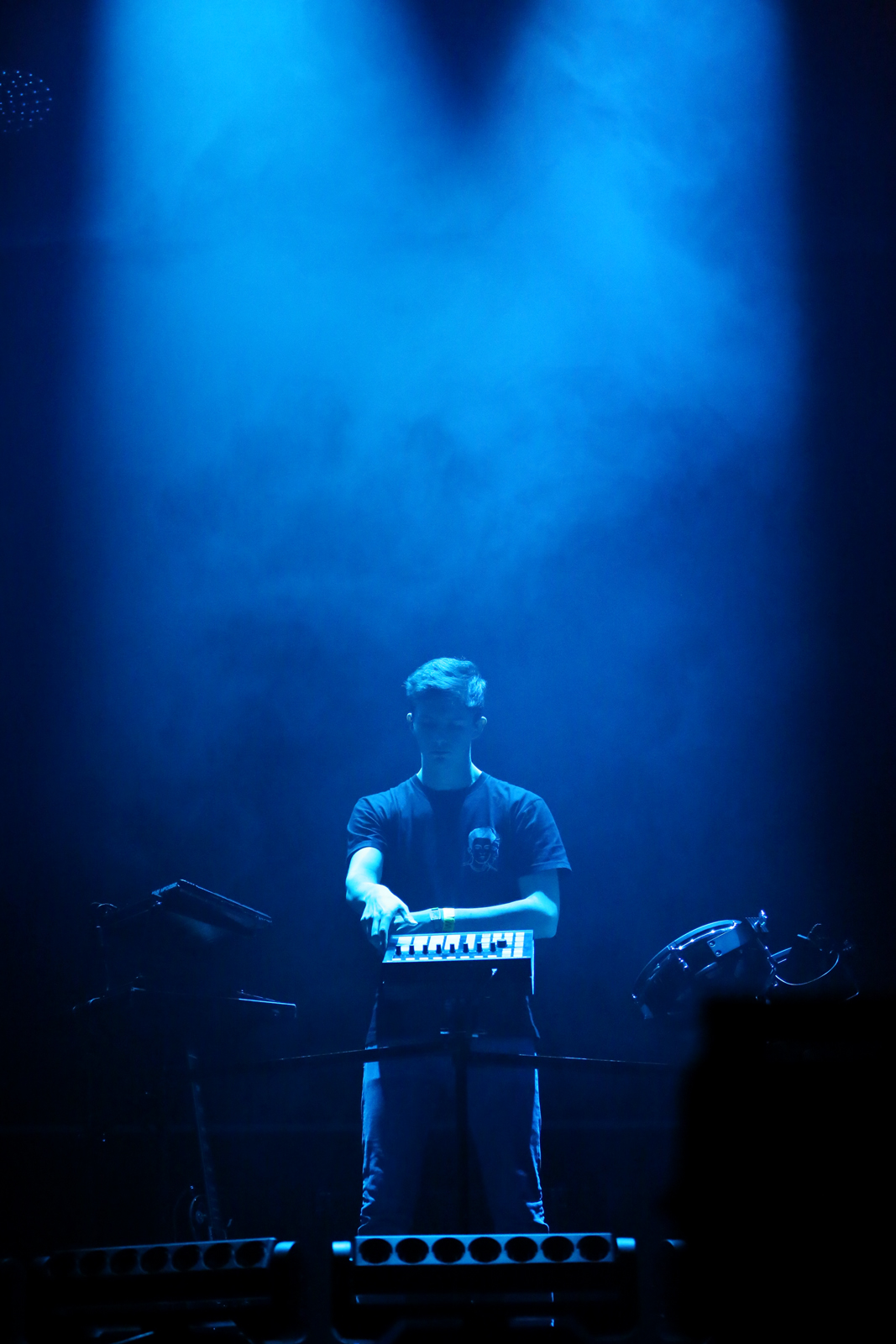 Dans la catégorie, jeune talent. Après Fakear la vieille, au tour du Petit Biscuit pour un DJset en solo. Alors que Fakear misait sur un gros dispositif (musicos, effets visuels…) le Rouennais auteur du génial Sunset Lover joue la discrétion avec guitare et écran fond de scène qui envoie des images d’aurores boréales.