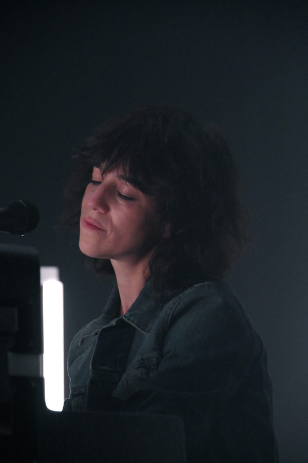 Sur scène, elle se dissimule derrière son double synthé ou derrière un bord de cadre juste devant elle.