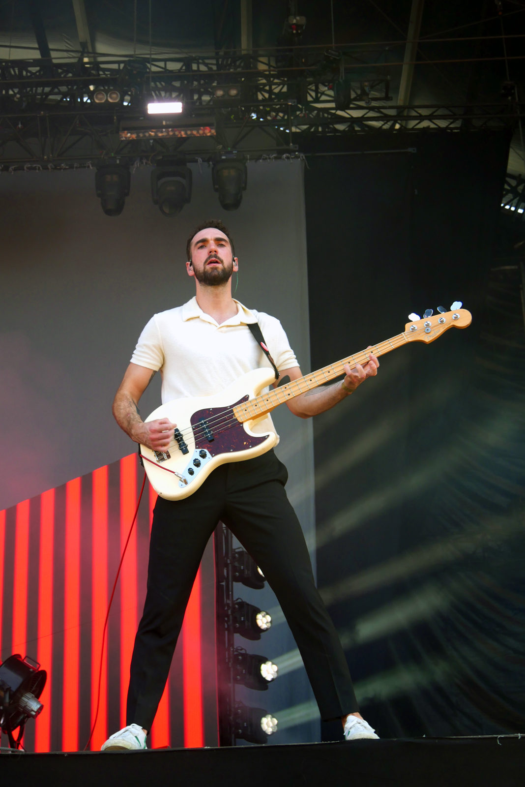 Col roulé et veste. Total respect pour Alex Trimble le chanteur qui assure le style jusqu’au bout malgré les 32 degrés ! Y’a une esthétique qui rappelle James Bond quand Alex prend la pose devant l’écran large.