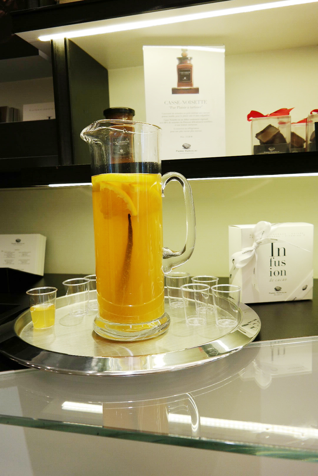 Chez Pierre Marcolini, expérience déroutante avec l’infusion de cacao glacée agrémentée de zeste d’agrumes. Très surprenante et pour le moins emballante. Rajoutez un petit chocolat coeur et le rythme de la rue à l’extérieur est tout de suite plus doux.