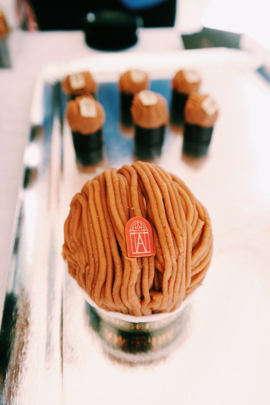 Et pour finir, un must qui se la joue sensation estivale : le Mont-Blanc d’Angelina. Pour la saison, il est agrémenté d’un coeur gelée framboise nuançant la force du tout marron que l’on apprécie plutôt en hiver. Pour les soucieux-ces de leur ligne, la version miniature saura aussi répondre à votre curiosité. Pour une de mes voisines trentenaires, c’était son premier Mont-Blanc.