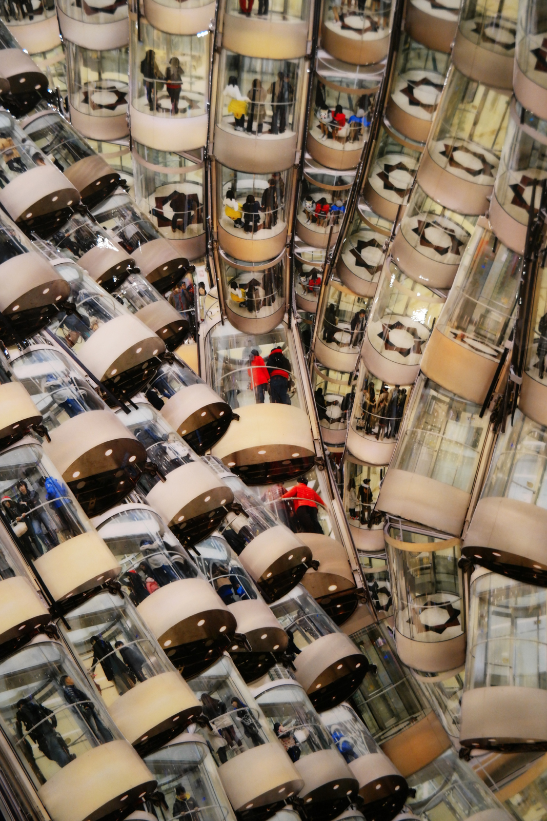 Suit le montage photographique psychédélique et étourdissant de Jiyen Lee. Les combinaisons d’ascenseurs font perdre tous les repères aux spectateurs.