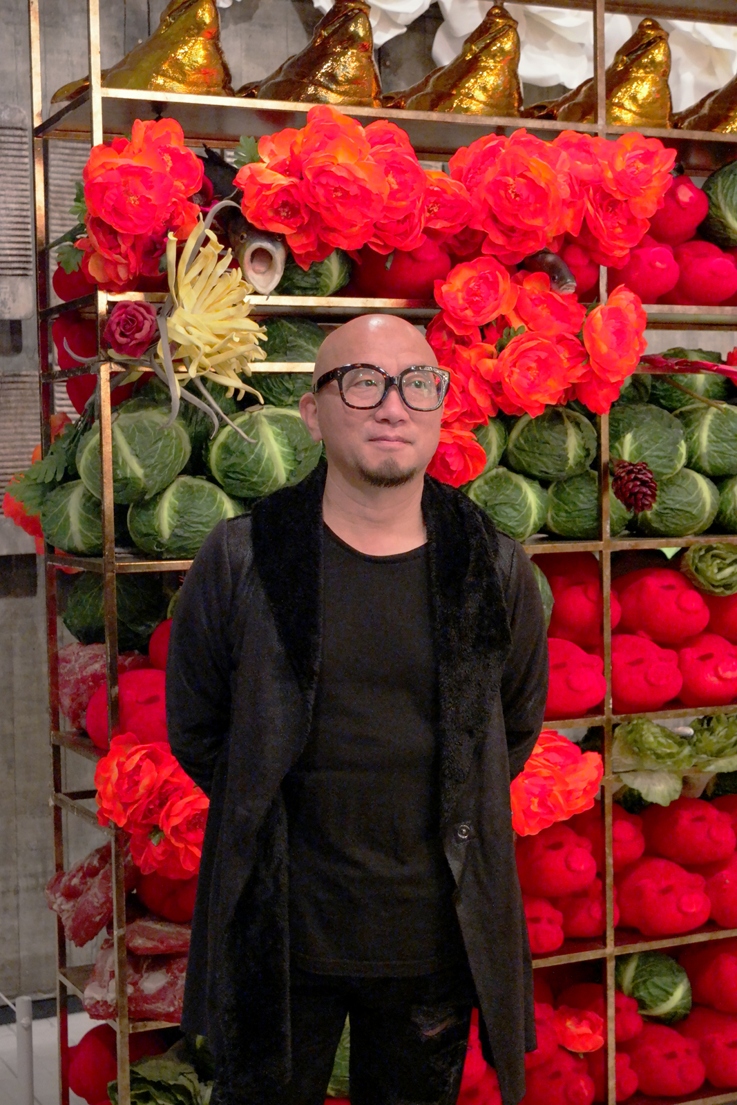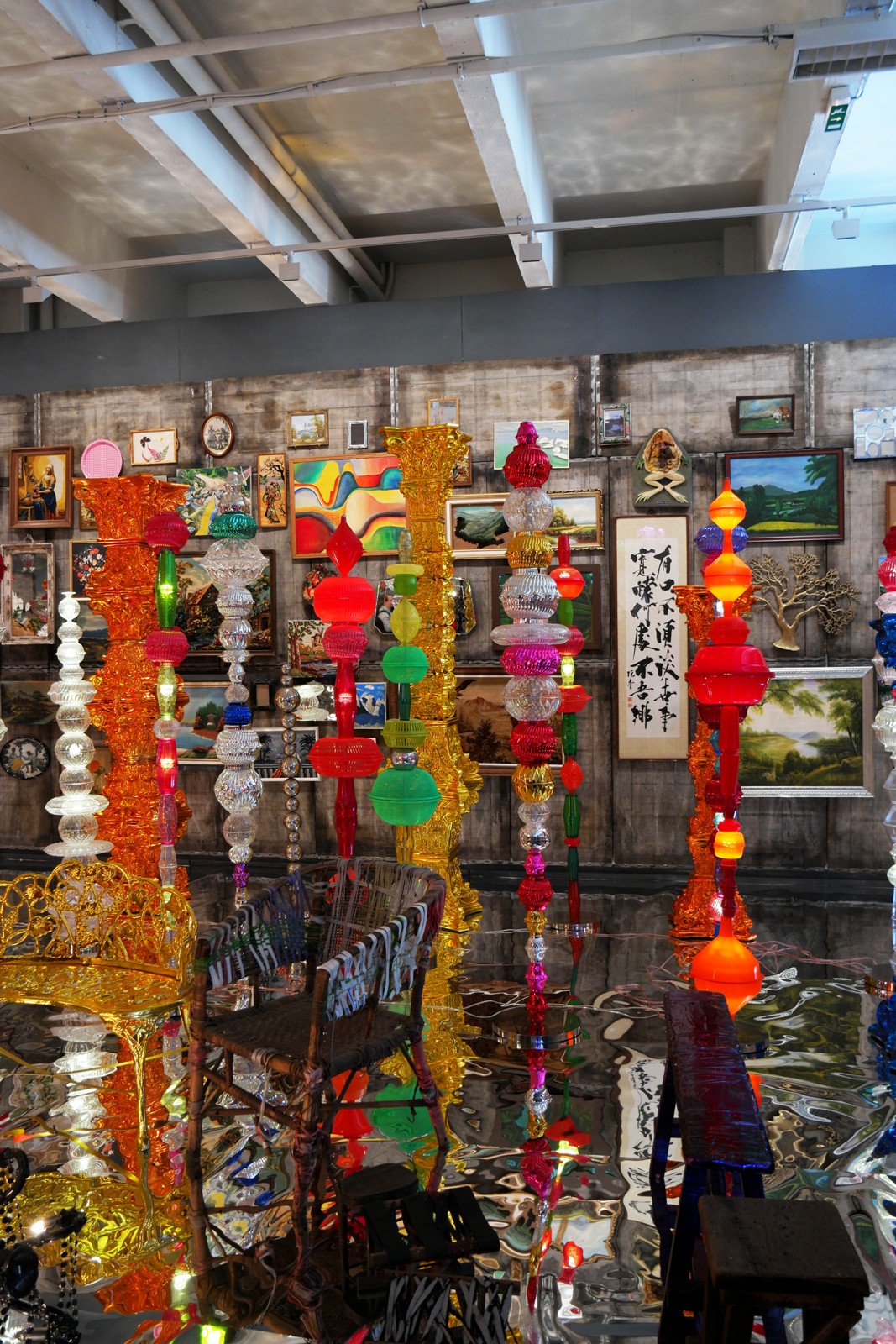 Juste avant, l’entrée de l’exposition se fait dans une sorte de capharnaüm organisé. Choi Jeong Hwa, qui a dispersé en plein Lille ses arbres à fruits et autres fleurs gonflées, nous donne une idée de son atelier-maison où il amasse toutes sortes d’objets plus ou moins pieux, plus ou moins utiles. C’est barré, coloré, festoyant !