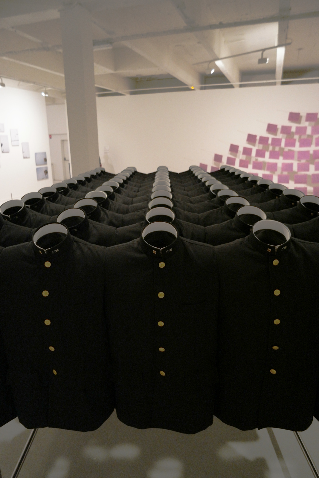 Avant de pénétrer la réplique d’un appartement coréen – prière de laisser vos chaussures à l’entrée – deux autres oeuvres frappantes. L’armée d’uniformes d’étudiants de Do Ho Suh qui évoque l’imposante masse que peut représenter l’univers scolaire pour les Coréens.
