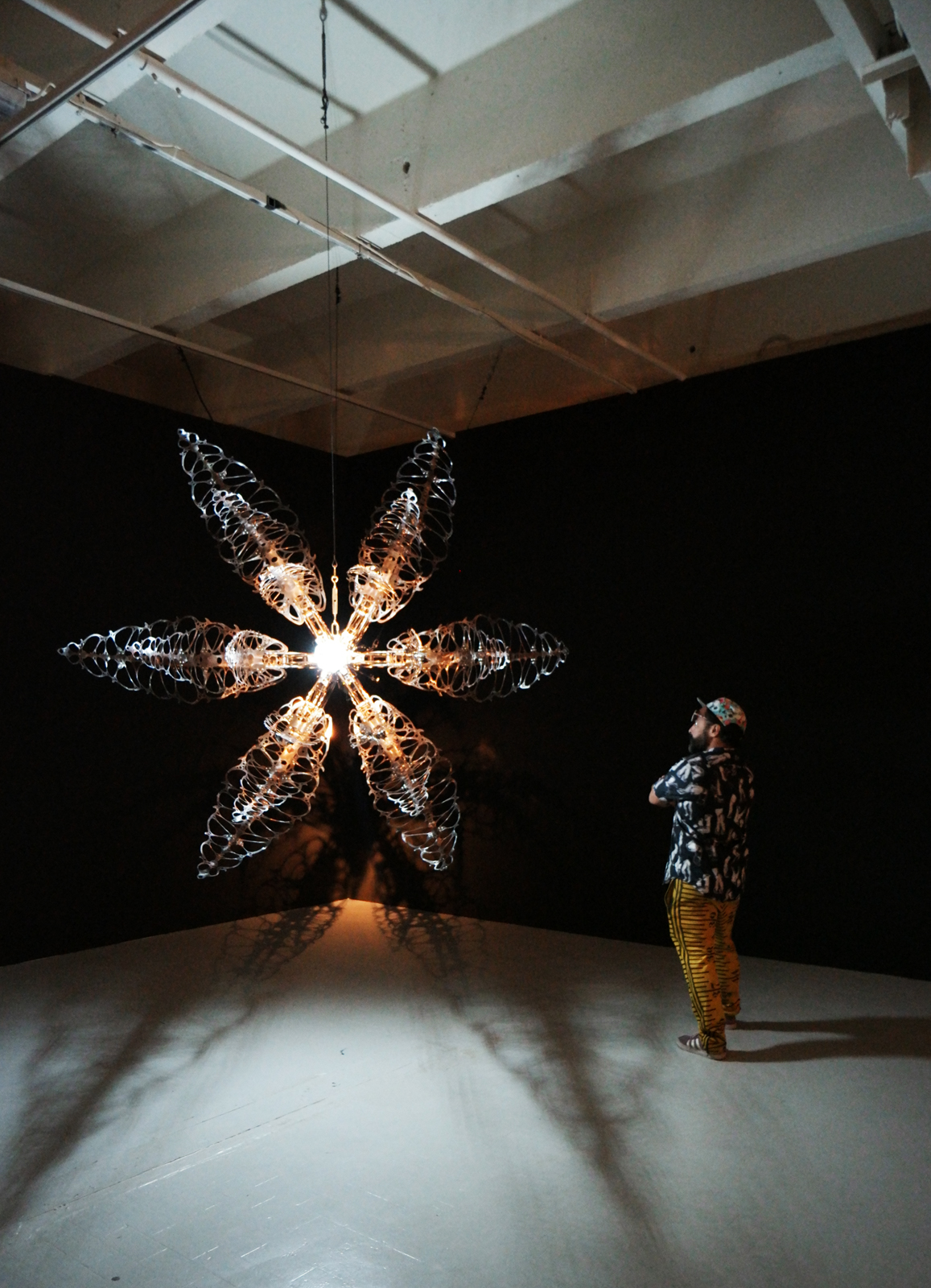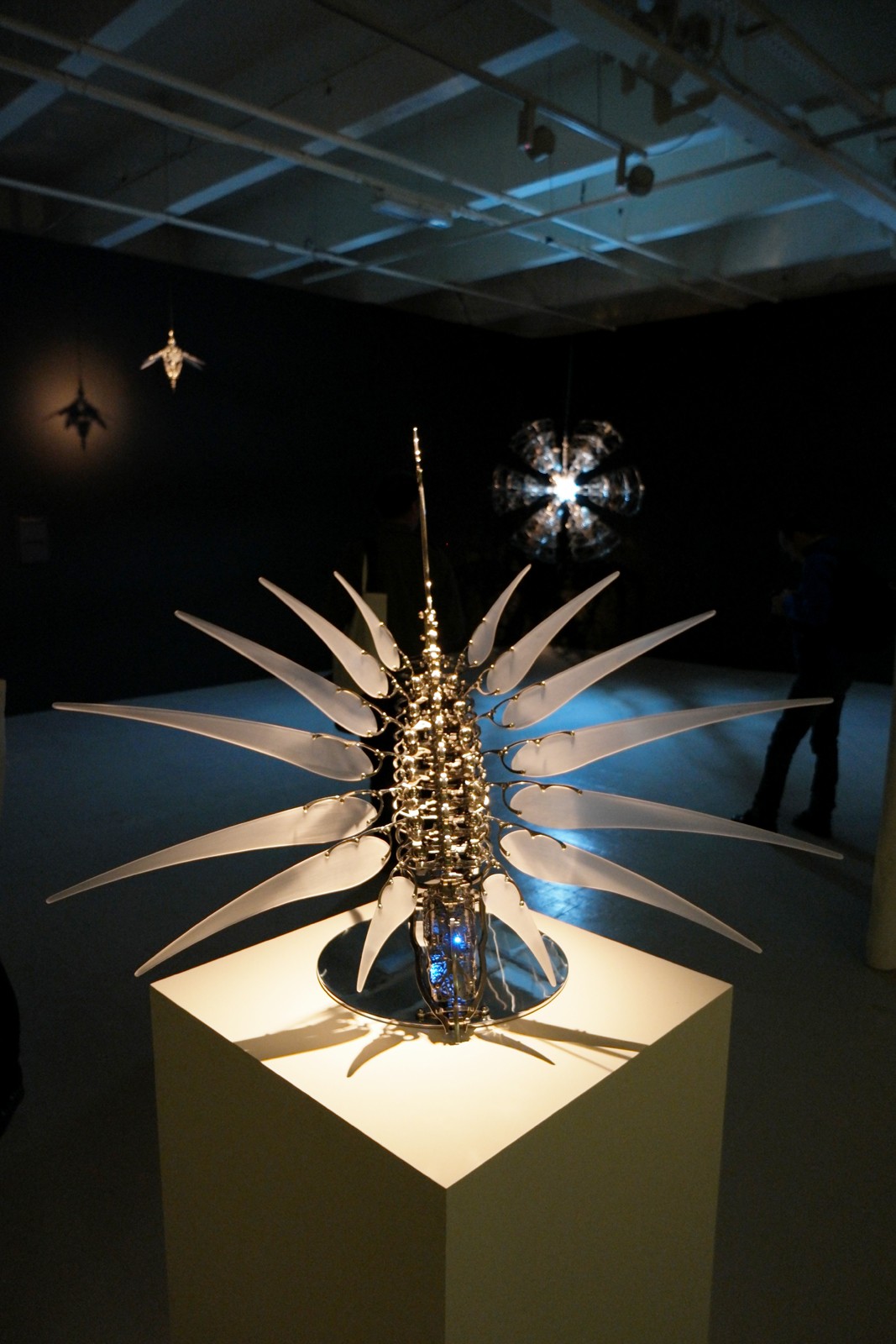 Et l’univers qui nous frappe en premier est sans aucun doute celui de Choe U-Ram qui invente des machines mi-insectes, mi-fleurs avec un petit côté Alien – si l’on n’était pas sûr à 100% qu’elles étaient bien domestiquées. Ces créations-créatures sont des sujets de fascination subjuguants. Urbanus Female est une sorte de fleur métallique qui ouvre ses pétales avec un tourbillon lumineux en son centre. On la croirait sortie tout droit du futur, native d’une forêt ou jungle inconnue, abandonnée.