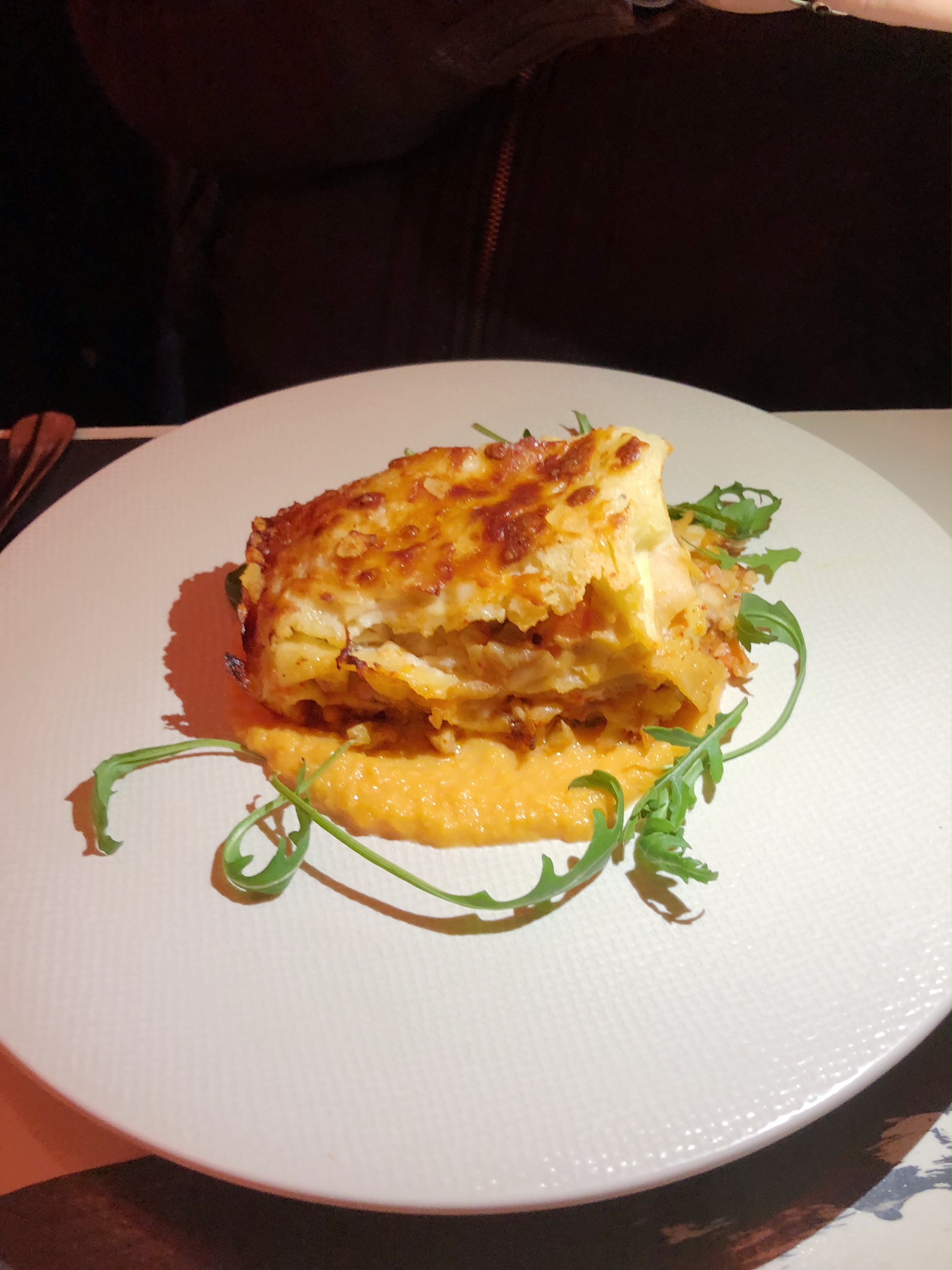 Dans la présentation, on retrouve le visuel d’une belle portion de lasagnes. Le trompe-l’œil italien est parfait. Le plus décoiffant est le kimchi, un chou coréen fermenté sur place.
