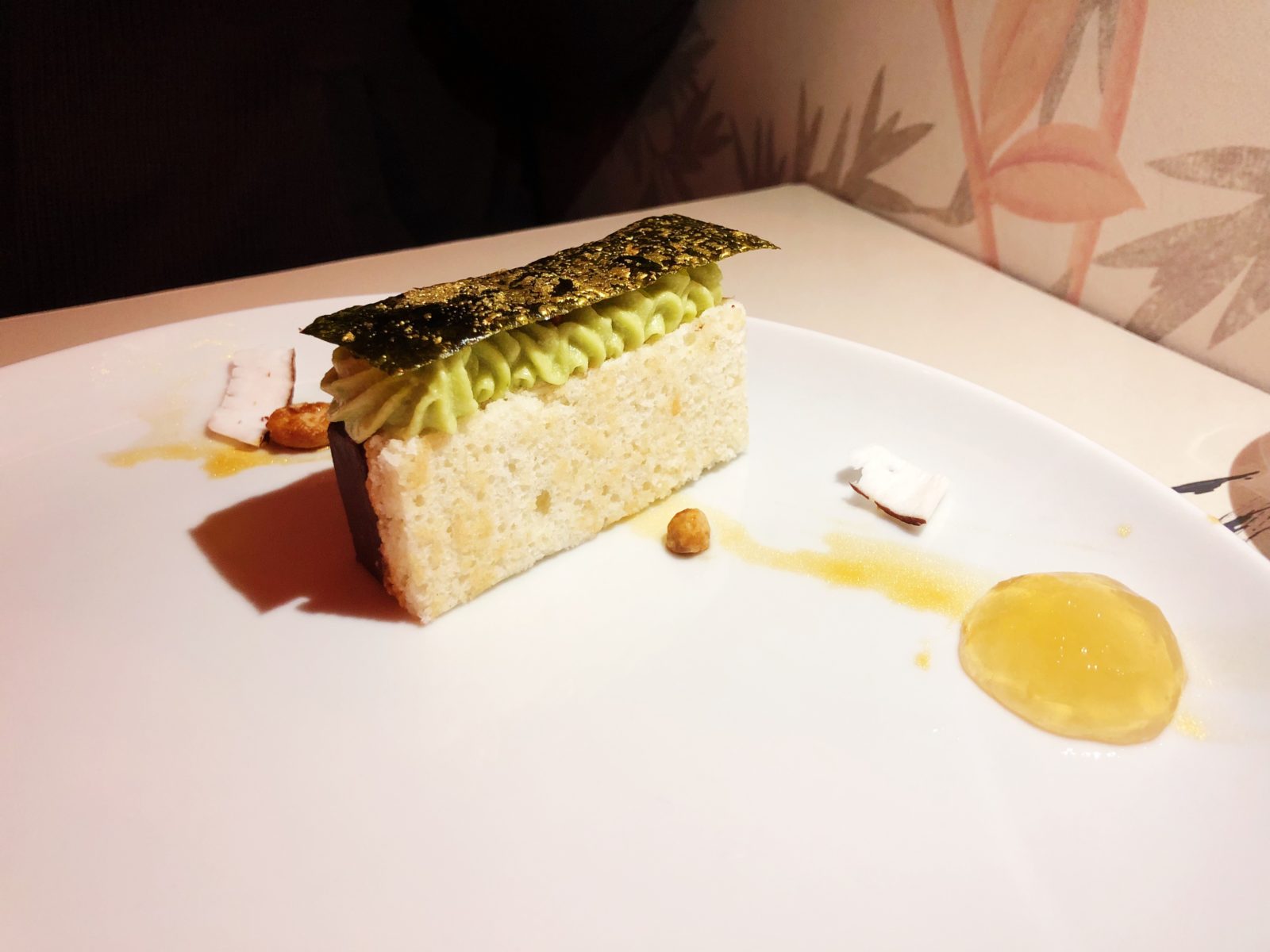 Le biscuit coco est accolé à une barre de chocolat noir ValRhona 66% des Caraïbes. Le toping de crème d’avocat est subtil, surprenant surtout agrémenté de sa chips d’algue Nori.