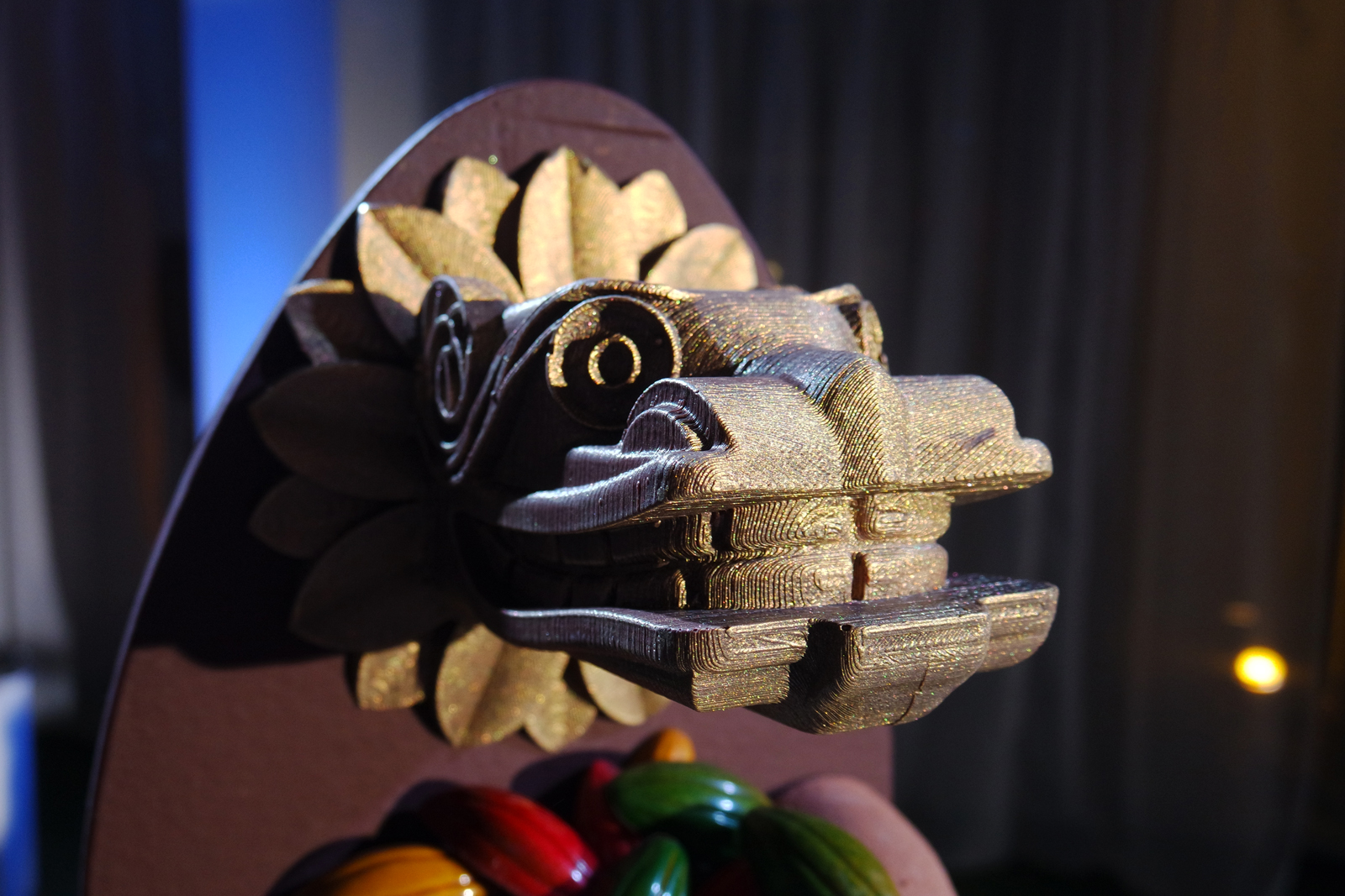 Modeste, le sourire visé au visage, le jeune Chef pâtissier, 25 ans au compteur, ne cache pas les étapes de cette prouesse sucrée et cacaotée. Ken Thomas souhaitait évoquer le Mexique en rappelant au passage que ce dernier est un grand pays de chocolat. Et quel autre symbole que celui du célèbre serpent à plumes célébré par les aztèques pouvait offrir ses traits pour cette sculpture ?