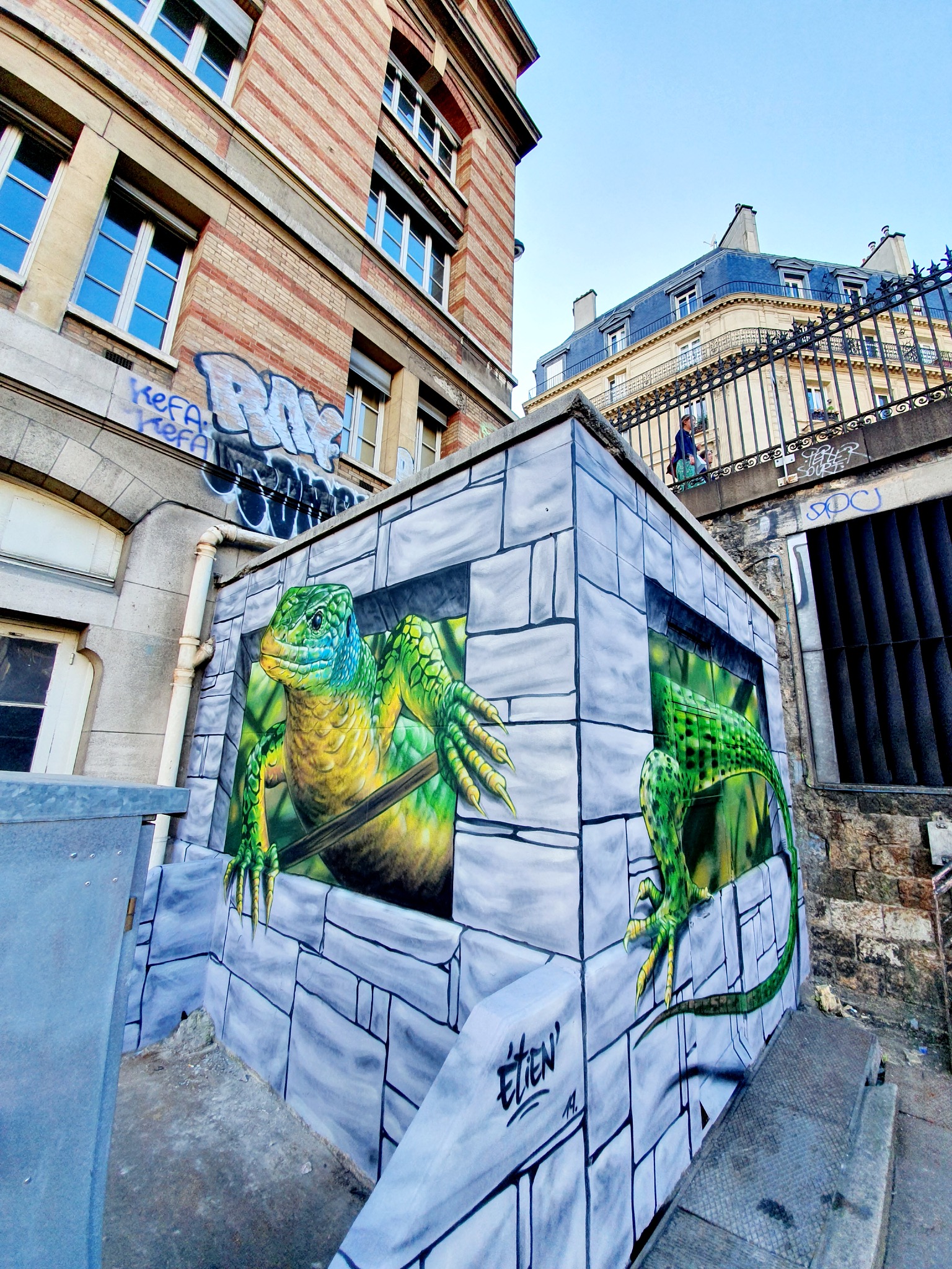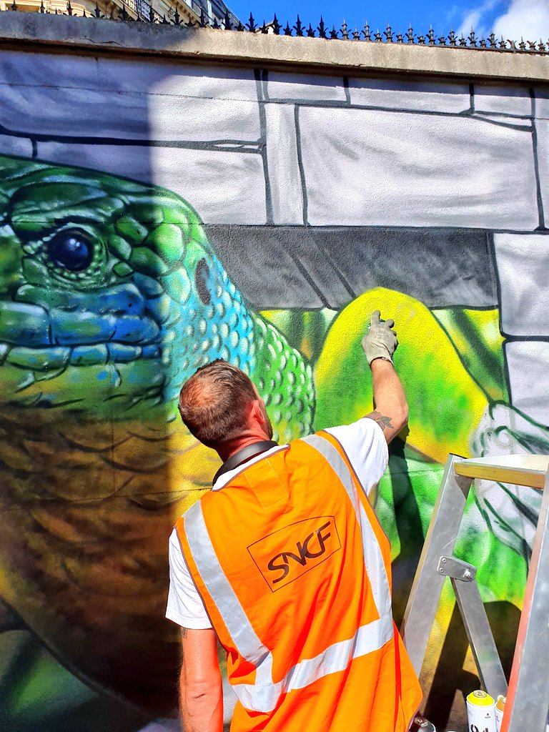 Son lézard clin d’œil-jeu de mot avec le lieu qui l’accueille se découvre de préférence au départ ou à l’arrivée des trains Transilien en gare ou en bout de quai.
