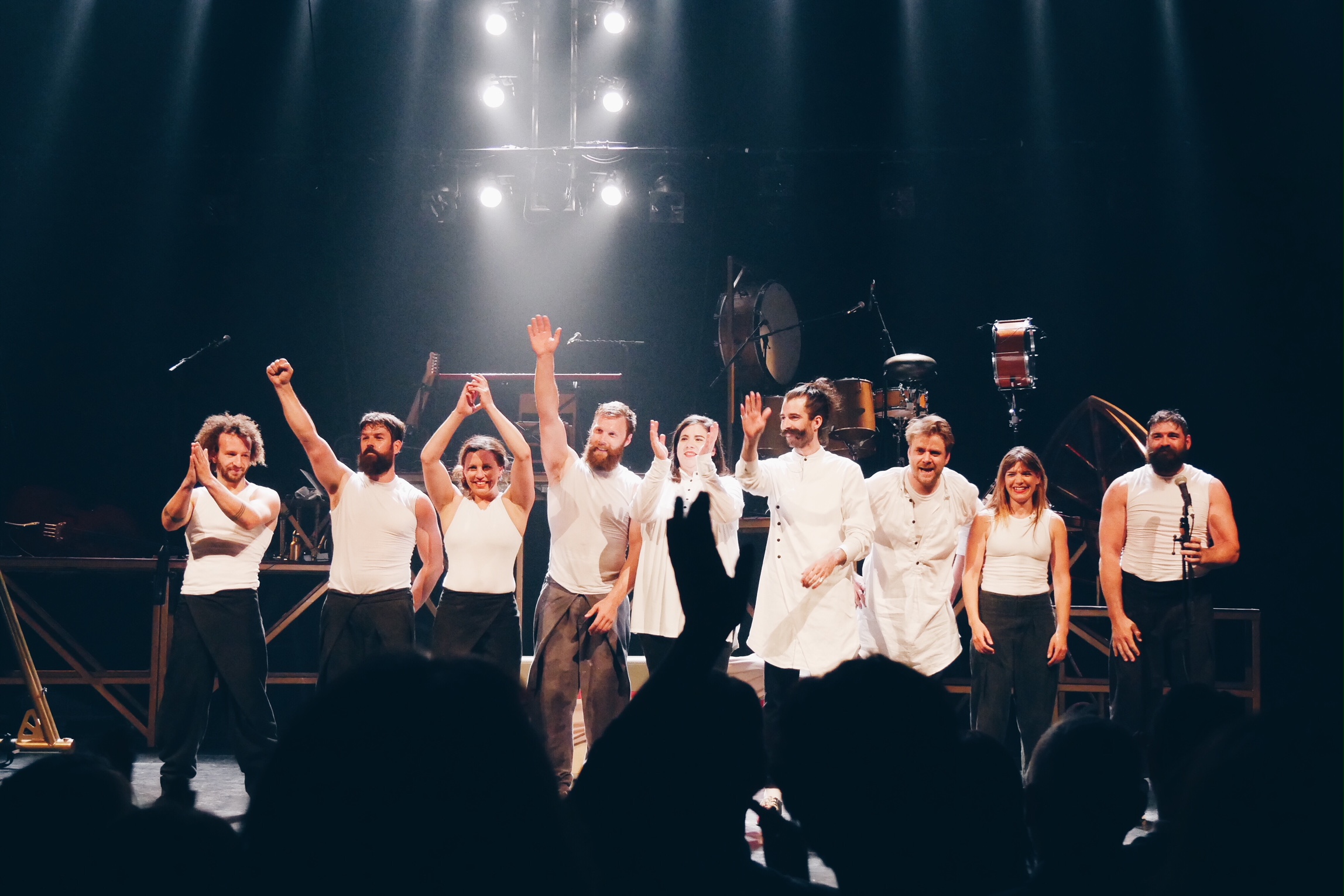 Le muscle est la vertu première de cette incroyable épopée bucolique en terres québécoises. Aussi le poil, de barbe, très représenté dans la troupe. Dans la première partie du spectacle, la troupe ne se sert que de son corps pour partager sa folie. Du tricot sage et collectif en attendant les spectateurs, on passe vite à une tornade qui pousse les bancs et fait grimper le vitrail dans les cintres de Bobino.