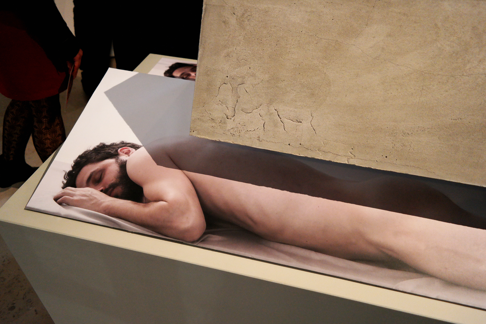 Un modèle joue les endormis parmi les oeuvres, discret. Le béton qui le surplombe impressionne et montre toute la fragilité de l’homme. Le travail de Benjamin Renoux est aussi poétique que fort tels les cadres photos qui portent le reflet de la pièce dans laquelle ils sont accrochés. #Beautiful !