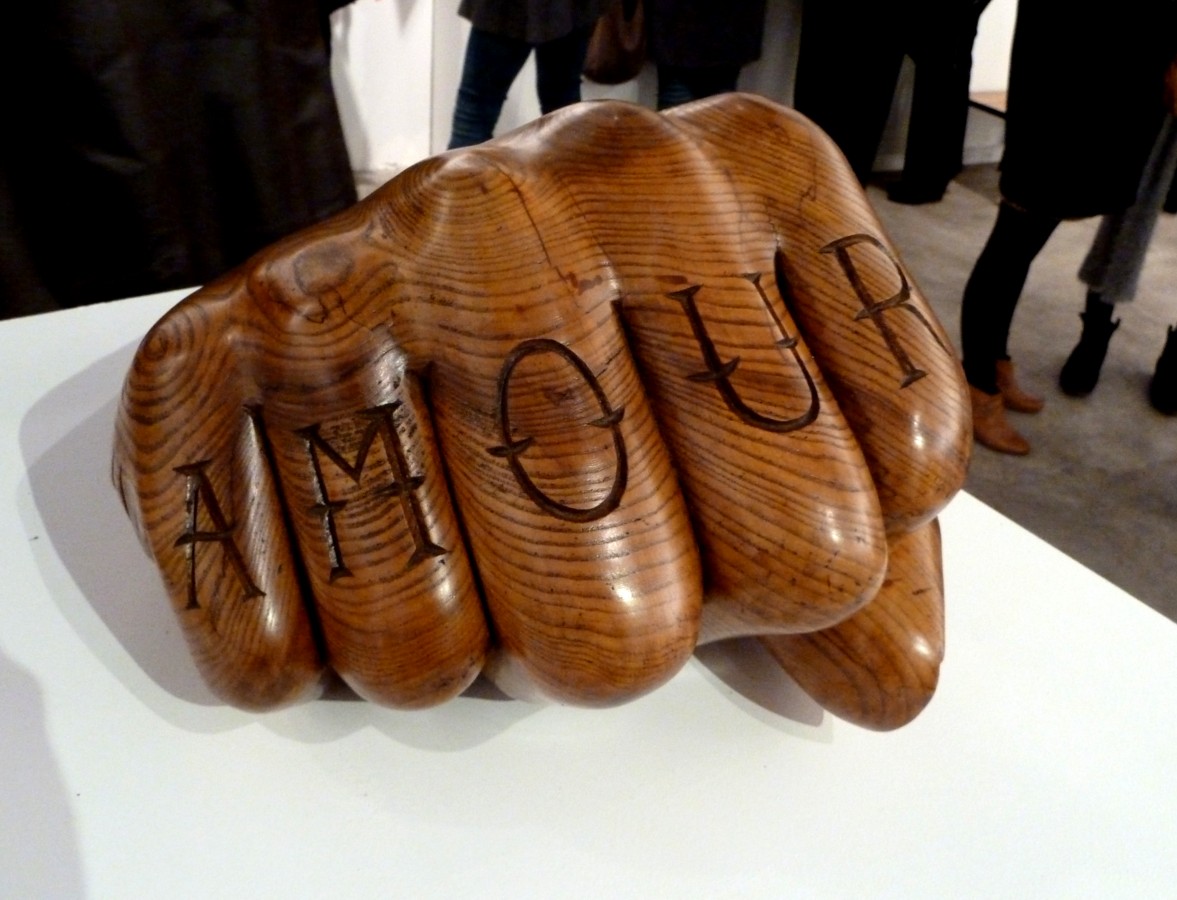 Plus inattendu pour les fins connaisseurs, cette nouvelle exposition est l’occasion de découvrir l’oeuvre sculptée de l’artiste. Un poing accueillant dans la salle principale, rappelle le film La nuit du chasseur. Il y est inscrit, comme un tatouage, le mot Amour. Souvenez-vous des mains tatouées de Robert Mitchum dans l’oeuvre de Laughton.