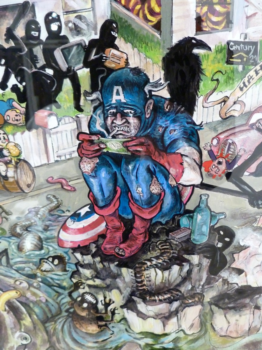 Le cynisme est toujours au détour de son trait, comme cette toile parodique détournant les figures magistrales la bande dessinée internationale. Fear offre une image de la dérive du monde avec l’exacerbation de tous ses penchants pervers: Tintin à terre est joyeusement tabassé alors que Captain America est en mauvaise passe.