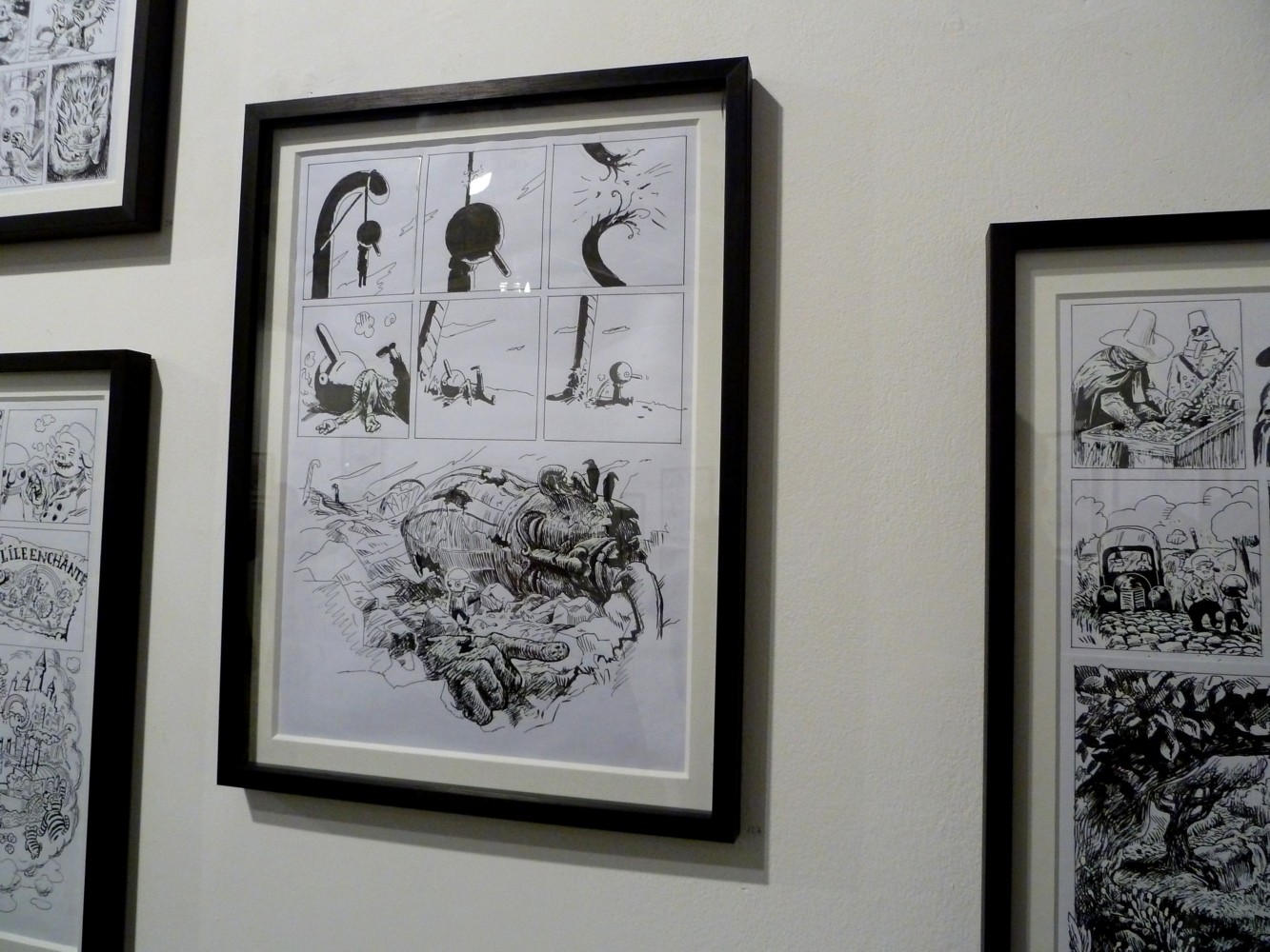 Les dessins originaux eux ne sont pas encadrés mais présentés sur des tables, le lieu même de leur création.