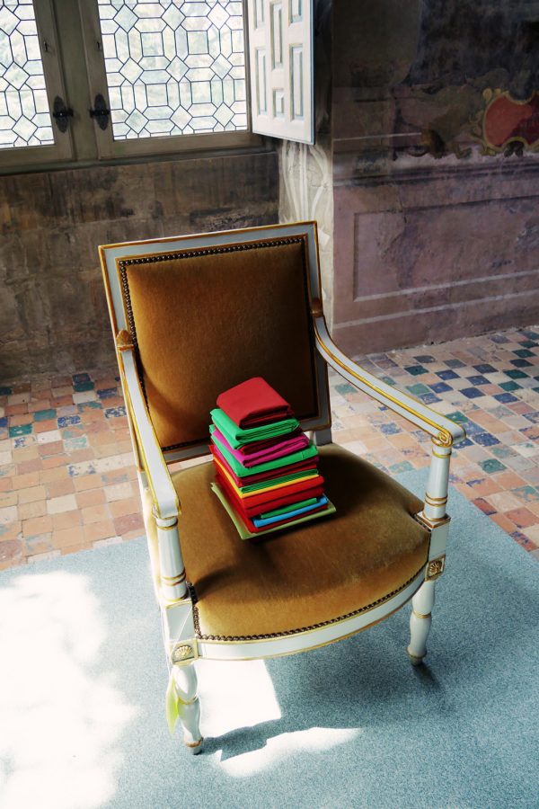 C’est à chacun-chacune d’apprécier ces ponctuations sur les murs et escaliers de pierres, ces installations qui viennent exceptionnellement remeubler le Château d’Orion. Canapé large et coussins, commode, armoire et autres sièges extraits des collections du Mobilier National.