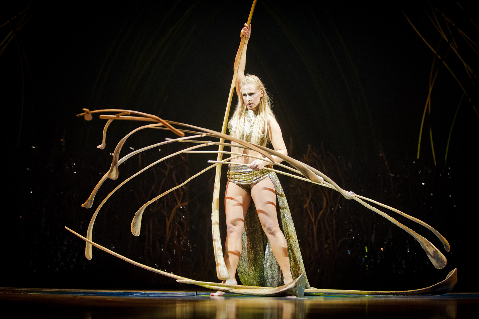 Un autre numéro, totalement inédit nous a aussi fait retenir notre souffle. ll s’agit de l’art délicat de la Déesse de l’équilibre. Une dizaine de minutes à manier ces plus ou moins longues tiges qui s’imbriquent les unes aux autres dans un jeu parfait avec l’air et la pesanteur. Sans musique, avec le simple souffle de l’artiste, la tension est intense et les respirations du public se font discrètes. La tentation de parler à son voisin n’est même pas envisageable.