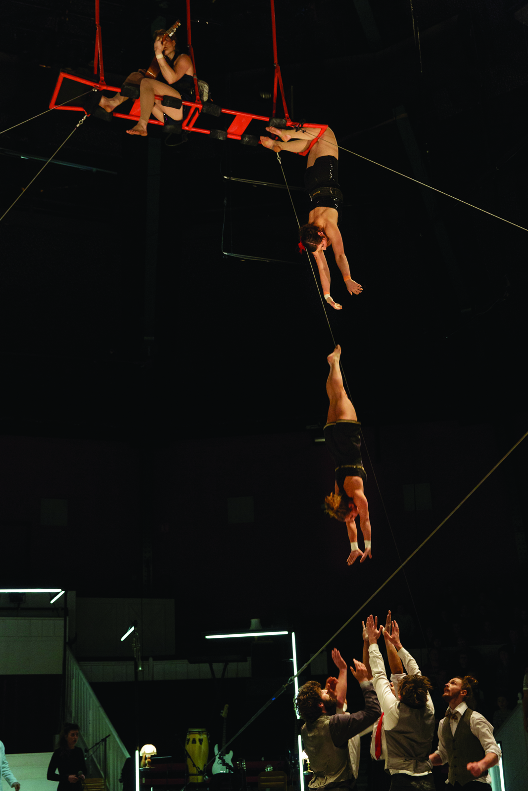 Wayra c’est un spectacle sans siège dans cet espace qui semble être un club interlope à notre arrivée. Le public est, en effet, debout pour s’en prendre plein les yeux, guidé par une équipe discrète qui orchestre les déplacements en fonction de l’action. Car cette dernière peut venir de toute part de la salle, dans un pur délire 360 degrés : en fond de scène, dans les airs, en plein milieu de la salle.