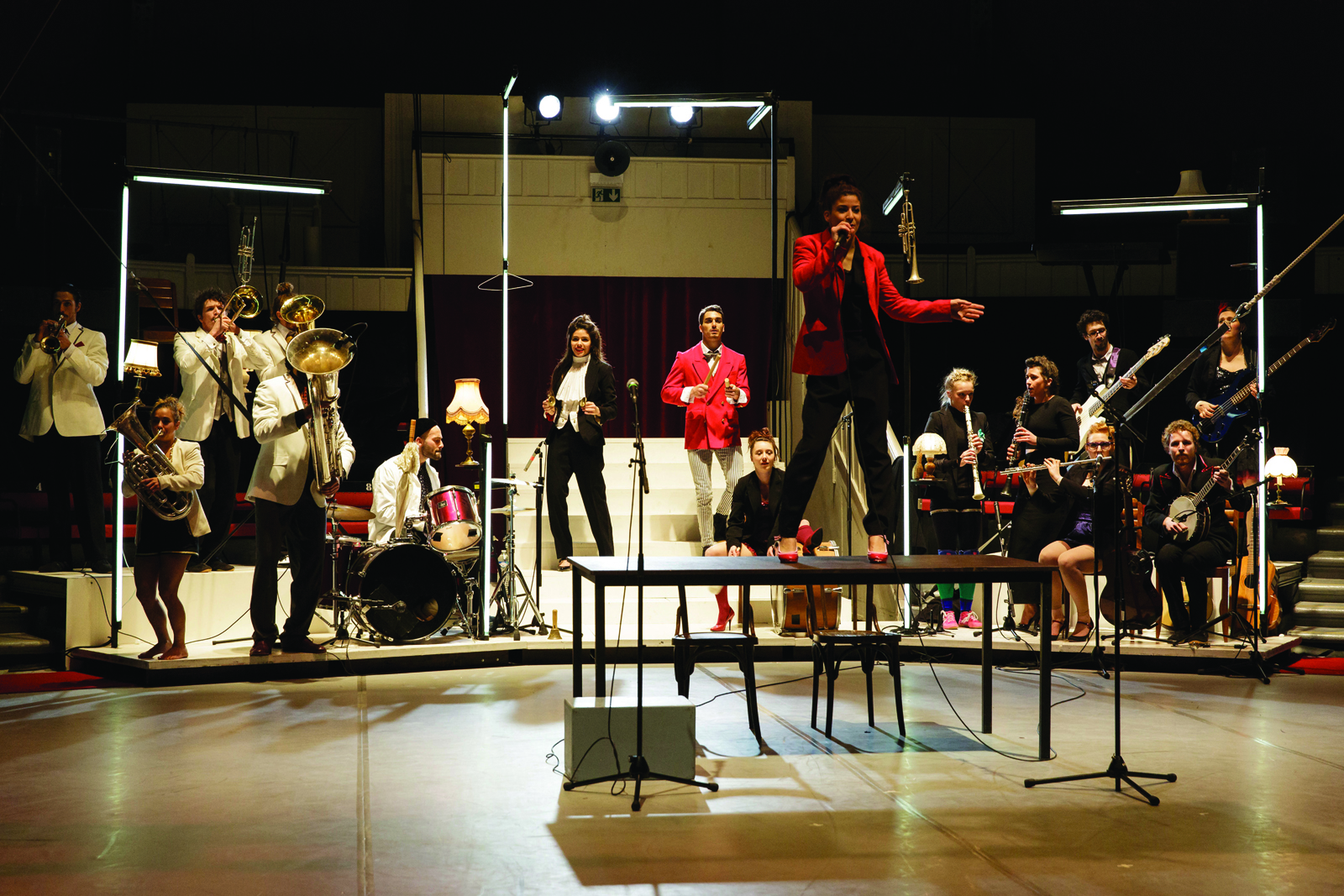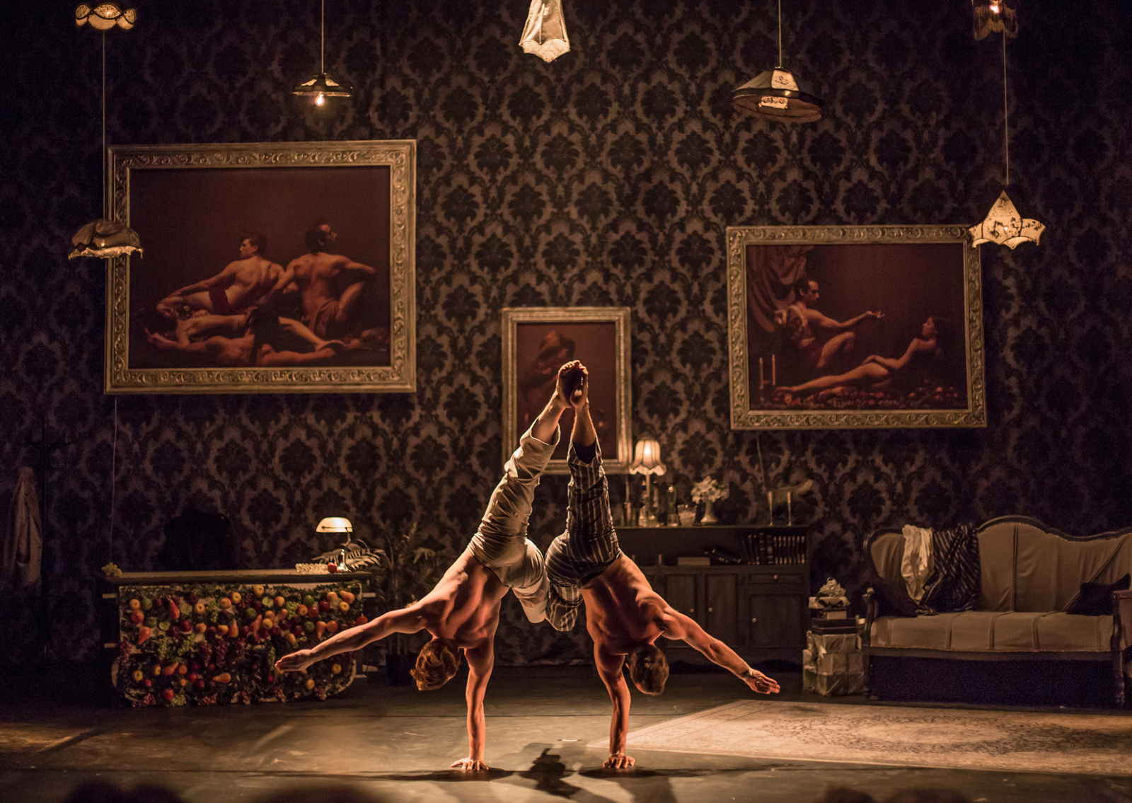 En fait, ça a commencé avec les lampes. Après, on les a fait descendre et on a commencé à faire des acrobaties en-dessous. On avait déjà les photos dans les cadres derrière. A un moment Charlotte Saliou, la metteuse en scène, a dit « Allez, on va essayer de pousser ça. Bouchon, tu rentres avec un plateau de fruits de 3 mètres. On pousse ça plus dans la décadence » C’est parti de nous et c’est elle qui a vraiment transformé ça.