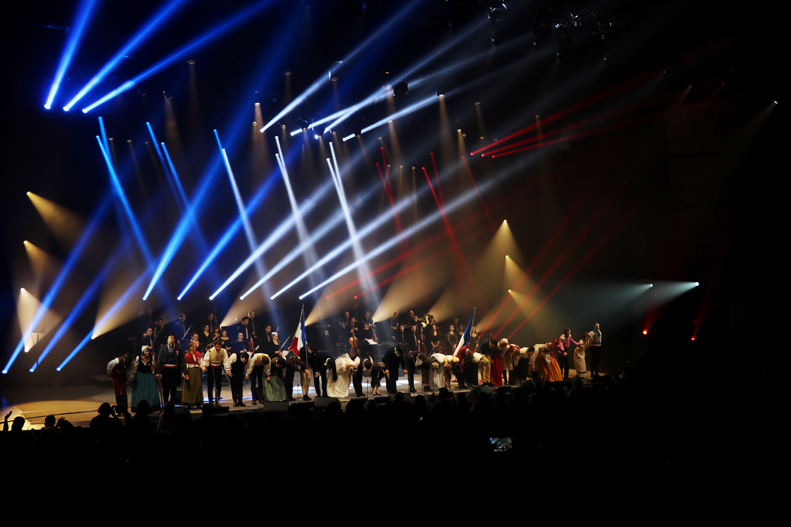18h45, c’est l’heure des balances. La troupe est sur scène avec l’orchestre pour les derniers réglages micros et lumières. 20h30, l’orchestre entre sur scène sous les applaudissements du public. Victor Hugo à son pupitre commence son récit des Misérables.