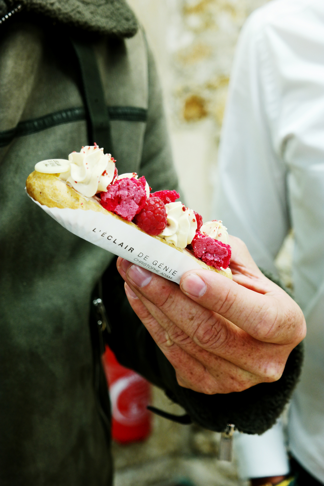 Olivier de Benoist a inspiré l’éclair n°151 ; il voulait de la framboise et de la couleur. Et ce très bel alliage de confit framboise fleur d’oranger et de ganache montée dulcey avec de vraies belles framboises posées à la main répond à ses attentes. Avec le petit plus : les morceaux de biscuits de Reims made in Eclair de Génie. Et ne nous faîtes pas dire que c’est notre préféré. Nous ne les avons pas tous goûtés, mais il se dégage du trio que nous avons approché. D’autant qu’il nous rappelle nos barlettes chéries.