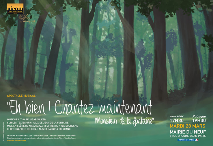 L’AICOM, la première école de comédie musicale en France, fait chanter Jean de La Fontaine pour fêter le printemps. Les élèves de troisième année de la formation professionnelle vont braver le trac et montrer tous leurs talents le mardi 28 mars à la Mairie du 9e, à Paris.