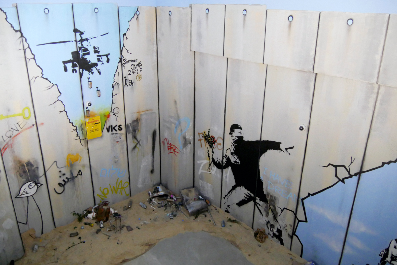 C’est aussi assez impressionnant de se retrouver face à une reproduction du mur séparant Israël et la Palestine : un des grands terrains de jeu de Banksy.