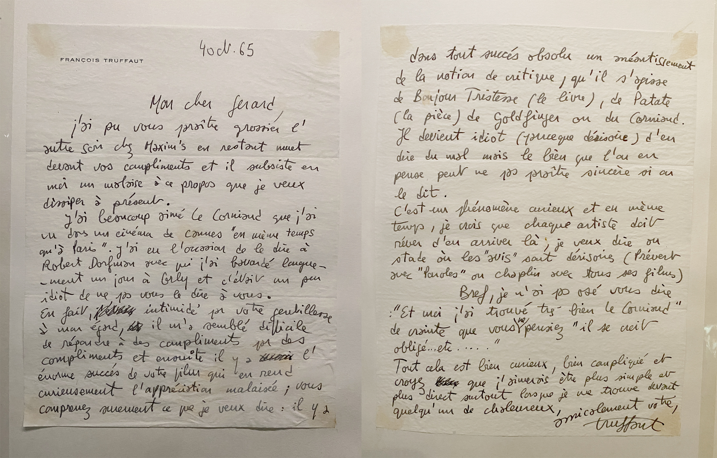 Les écrits abondent dans cette exposition : des scénarios annotés, des articles et de nombreuses lettres de l’acteur, ou des admirateurs inattendus comme François Truffaut.