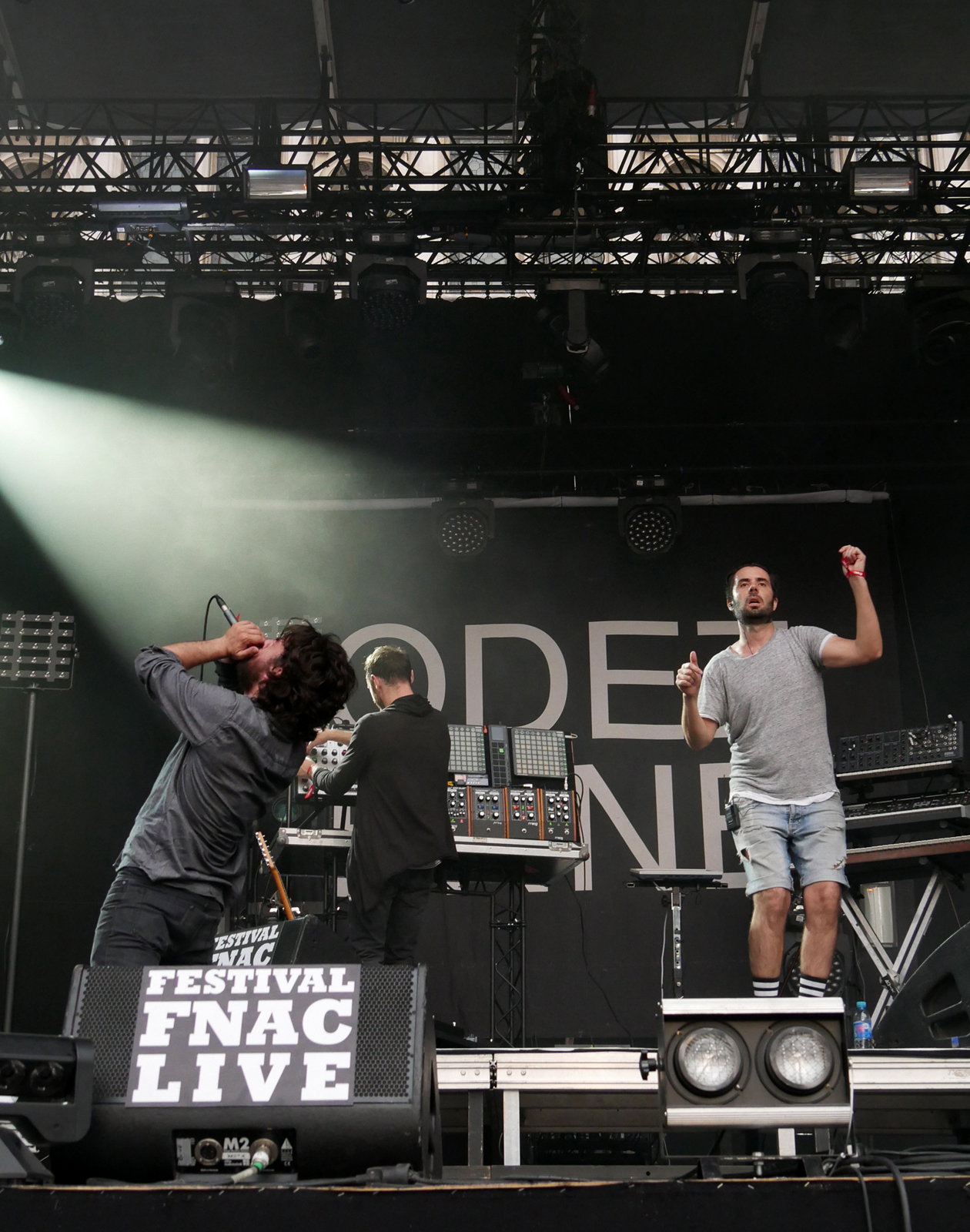 Fou à lier. Un festivalier torse poil, musclé comme un Dieu du Stade, lève les bras et est pris par la transe de Feu! Chatterton. Mélange des genres, surréaliste. Au FnacLive tout est possible ! Regardez bien votre voisin, il pourrait vous surprendre.