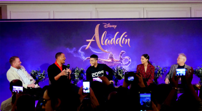 Mercredi 8 mai, conférence de presse du film Aladdin, le nouvel opus en live-action de Disney. L’attente est telle que la moitié de la salle est déjà remplie 30 minutes avant l’arrivée de l’équipe artistique. Cinq minutes avant l’entrée des acteurs, du réalisateur et du compositeur, un grand silence se fait dans la salle.
