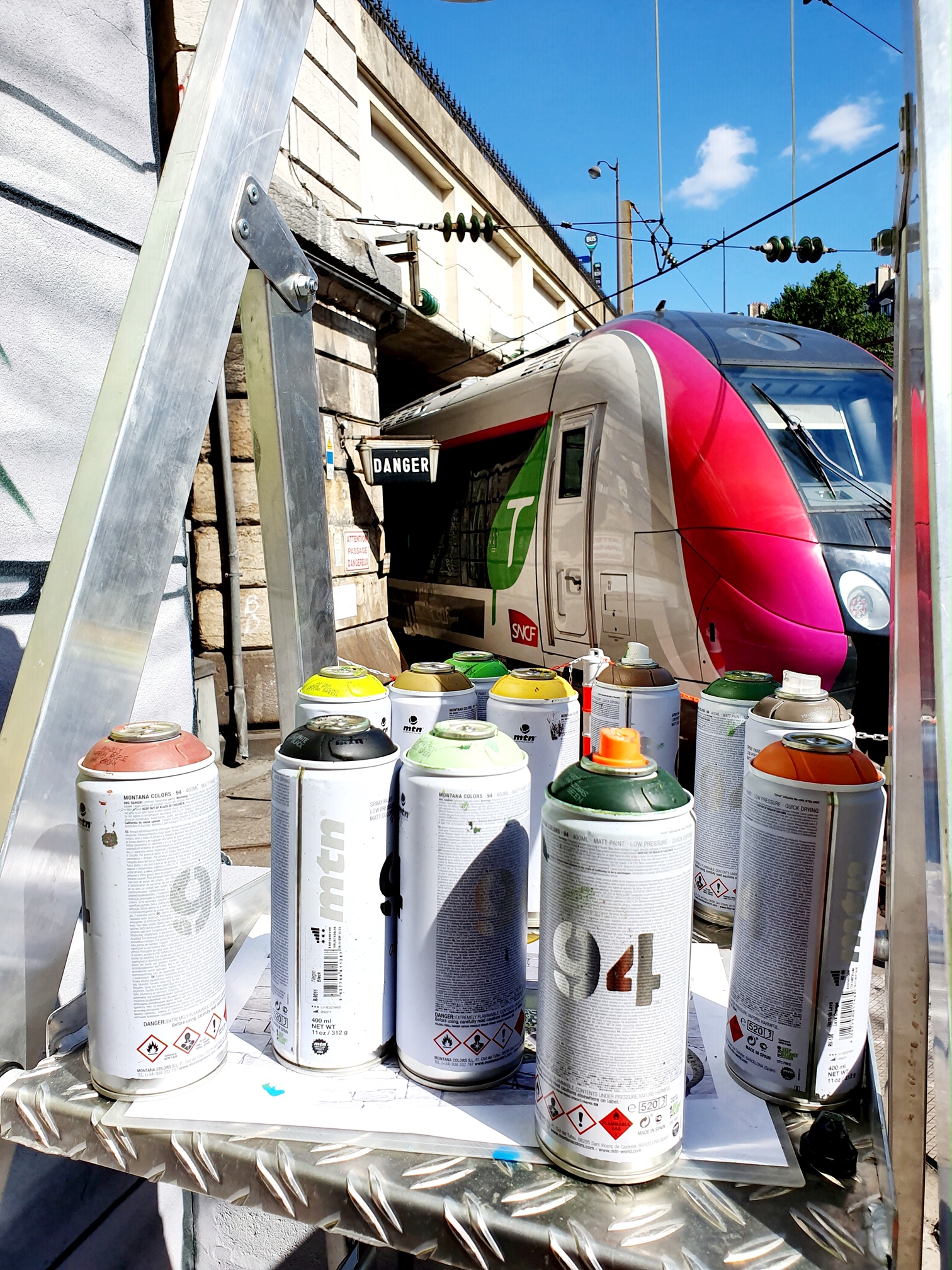 Nous avons rencontré Etien’ au cours de ses 2 jours de travail à la bombe aérosol, rythmés par le soleil, le passage des trains et les premiers spectateurs étonnés.