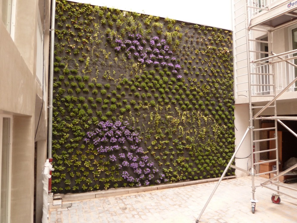 Ce mercredi, on inaugurait le jardin vertical. Les fleurs ont pris leur place dans la cour intérieure. Histoire d’égayer les murs nus attendant leur crépi et de prendre tout leur temps pour s’étoffer avant le jour J de l’ouverture.