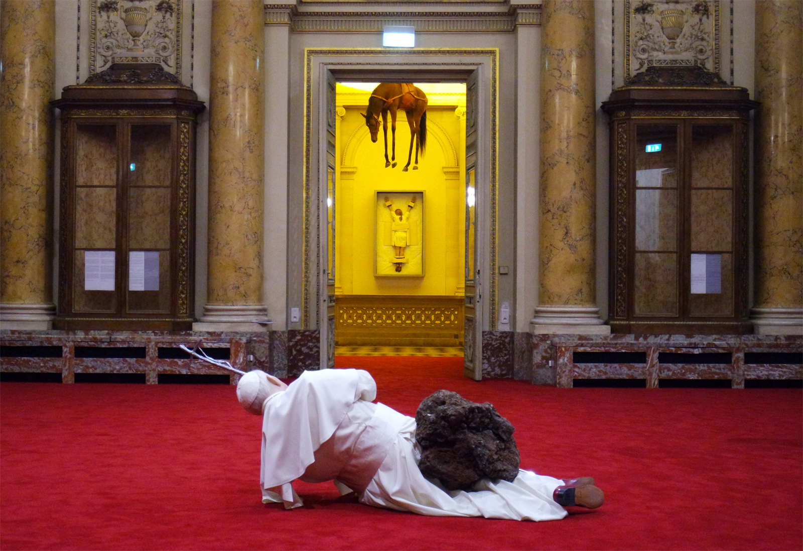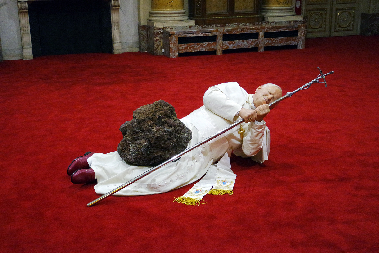 C’est bien l’une des deux pièces emblématiques qui commence véritablement l’exposition : le Pape Jean-Paul II écrasé par une météorite.