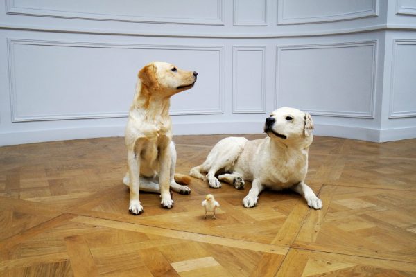 Et parfois c’est très subtil, comme avec ces deux labradors qui semblent surveiller, chacun de son côté, une des deux portes de la salle.