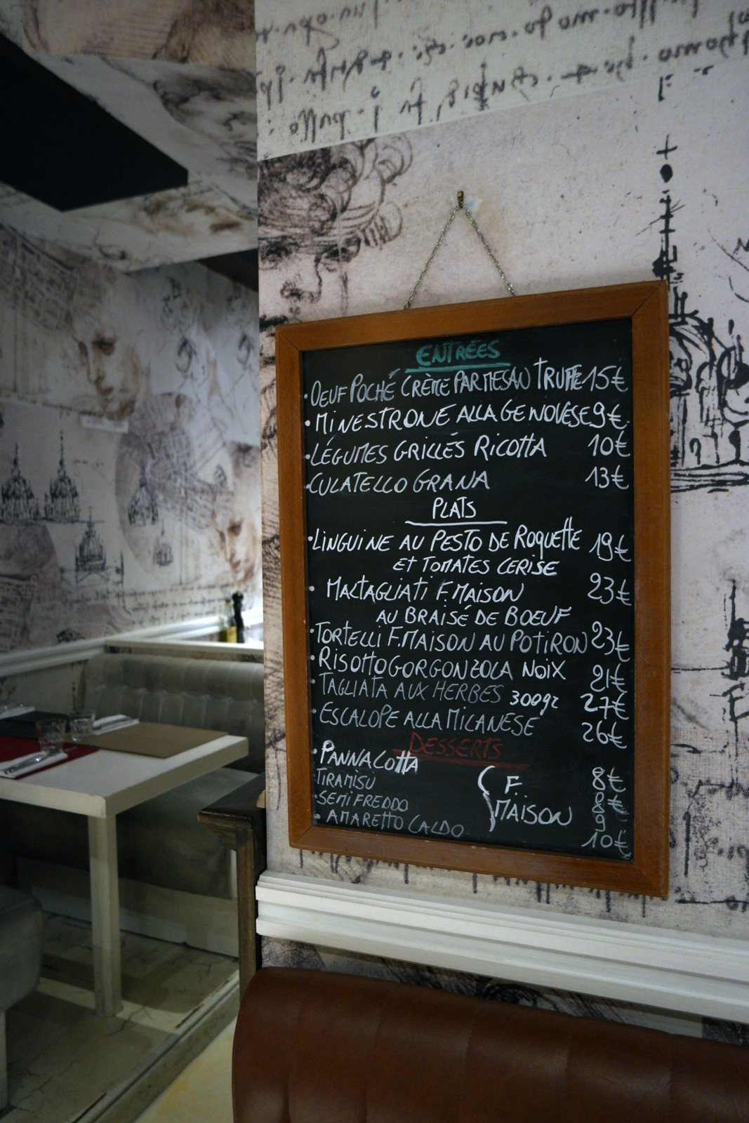 Dans le menu du jour et la carte qui nous est tendue, difficile de faire un choix parmi les propositions alléchantes : nous aurions envie de picorer pour toutes les gouter tellement elles semblent promettre de vraies saveurs transalpines.