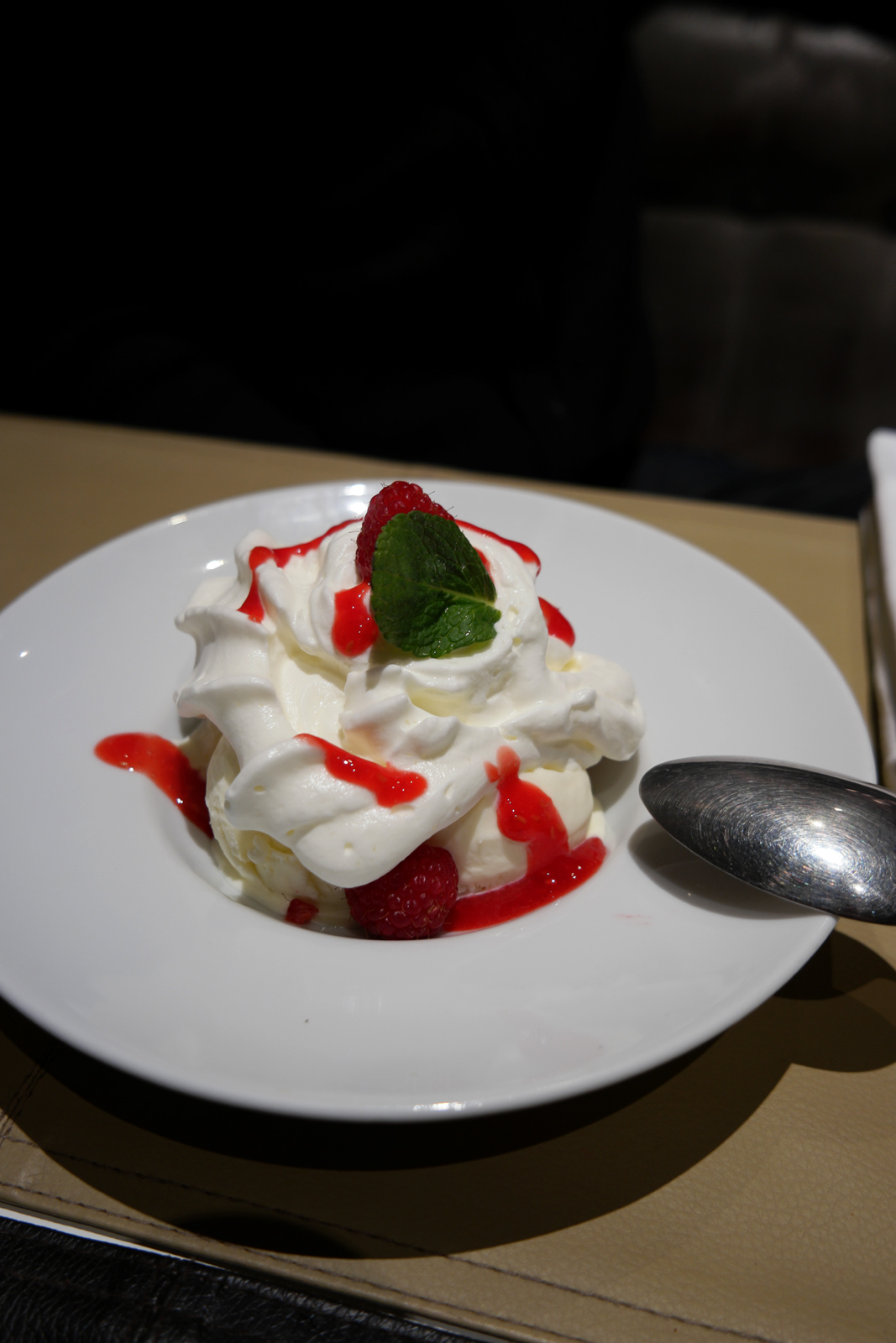 Glace, chantilly, coulis de framboise (ou de chocolat), fait maison, comme le tiramisu.
