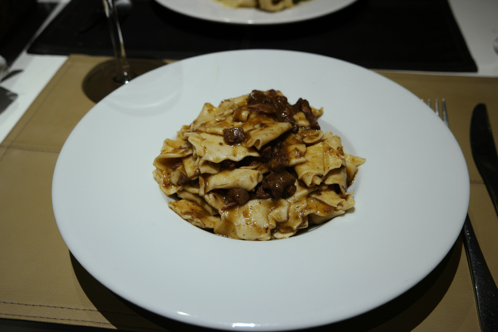 Les pâtes fraîches garnissent bien l’assiette. Le bœuf braisé émietté est fondant, contre toute attente. Et lorsque vous mélangez le jus et les pâtes : Mamma mia ! C’est succulent et copieux.