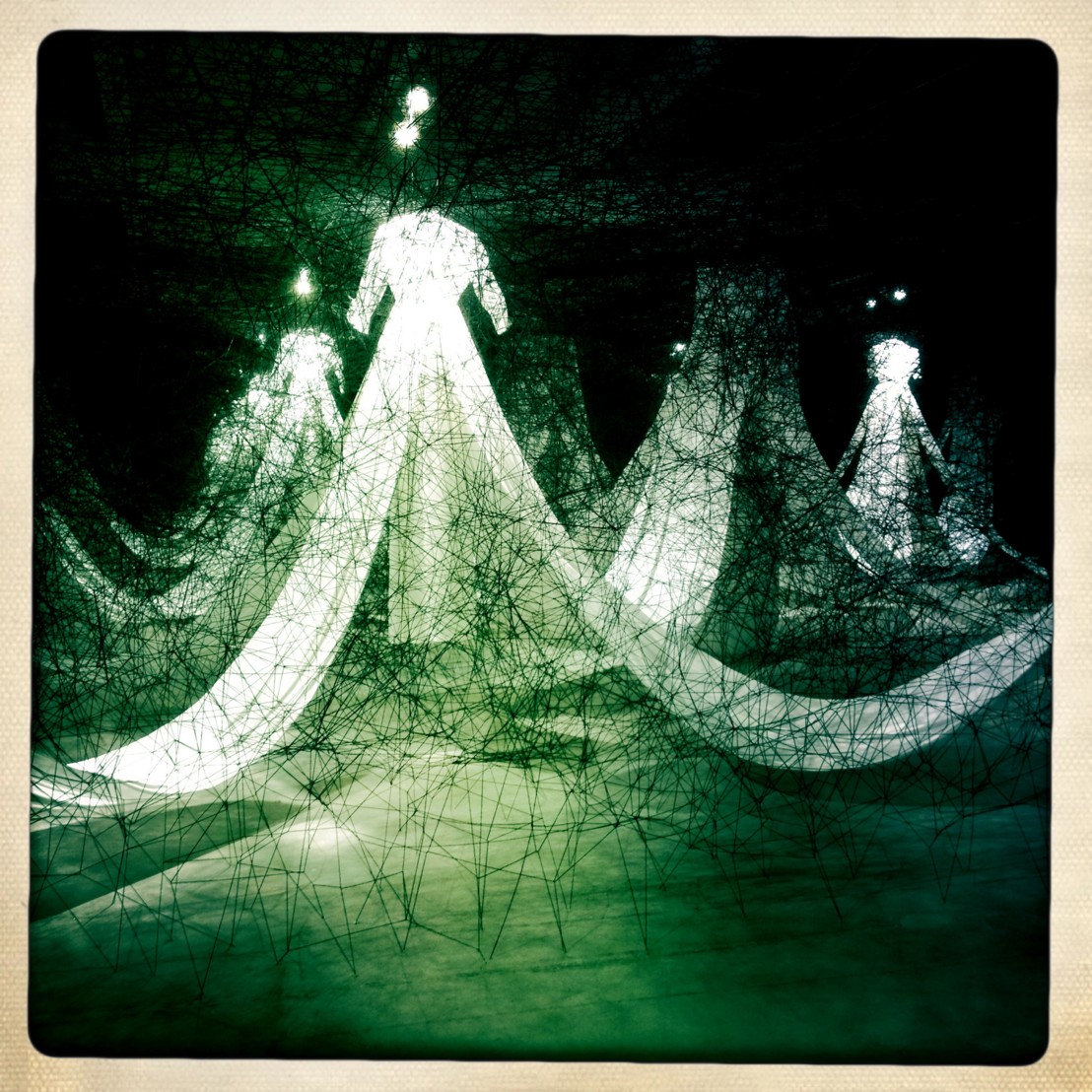 Et à l’entrée, l’œuvre radicale portée par la blancheur immaculée de 12 robes du styliste lyonnais Mongi Guibane, suspendues émergeant d’une nuée de fils, envahie le champ visuel du visiteur. Aucune sortie de secours, le rapport à l’œuvre est frontal. Les allées de chaque côté de la scénographie centrale forment des tunnels où pourrait se nicher tout type d’insecte plus ou moins attentionné.