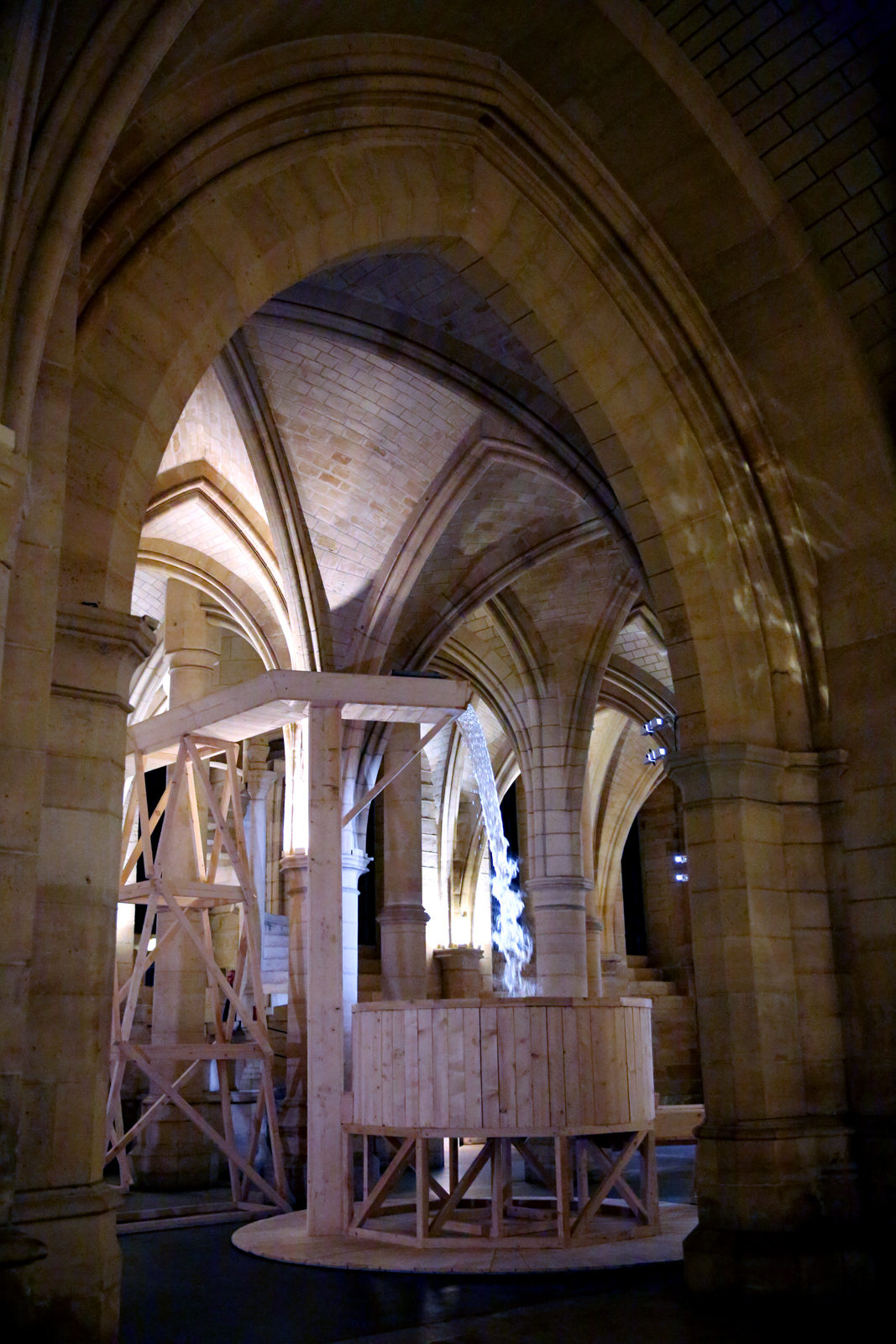 Cascade lumineuse dans la salle des Gardes, lumière tamisée, cours d’eau calmé, reflets, duo pierre/bois du meilleur effet…