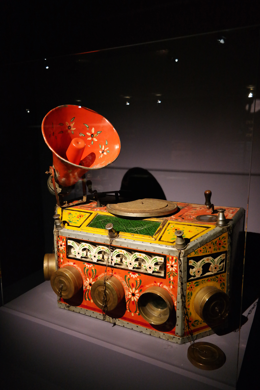 Un peu plus loin, un vélo japonais avec kamishibai datant de 1930-1940. Il était le partenaire de conteurs qui produisait un spectacle à l’aide d’images animées. Un autre inconnu, un appareil de cinéma ambulant indien dont la boite métallique renferme un film.