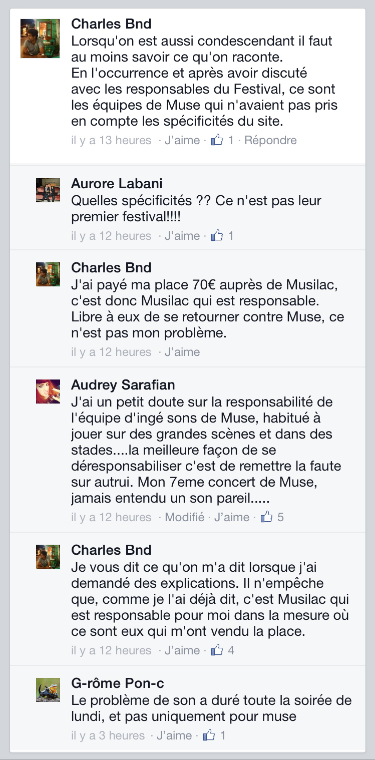 Facebook musilac muse bonus day live problème son concert 13 juillet 2015