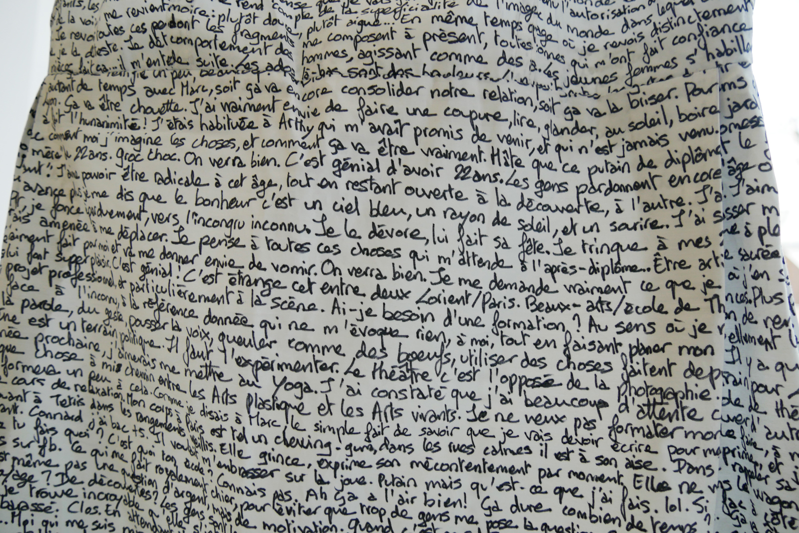 Travail sur l’intime avec l’artiste Julie Le Toquin qui offre à tous et toutes des lignes entières de son journal. Plus troublant encore de se trouver face à cette Robe écriture qui tourne sur elle-même dévoilant ainsi des bribes de moments personnels. Cette robe, l’artiste la porte. Elle porte et assume ses propres mots, sa mémoire.