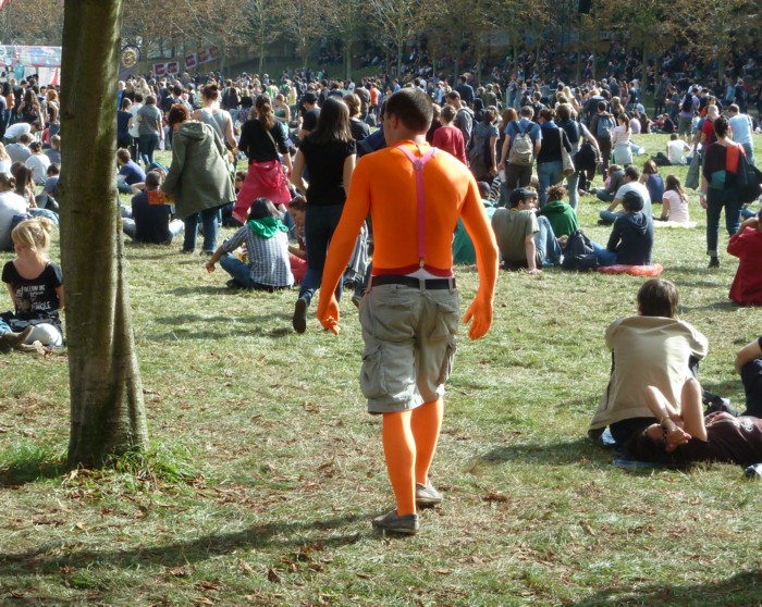 Bien sûr, Macklemore en fait des tonnes. Trop de franges à sa veste noire puis son gilet rouge, une chemise à rayures verticales qui fait mal aux yeux, des changements de costumes à chaque chanson comme Lady Gaga, des sauts sur scène et des caisses sur « Paris my favorite city in the world… blabla».