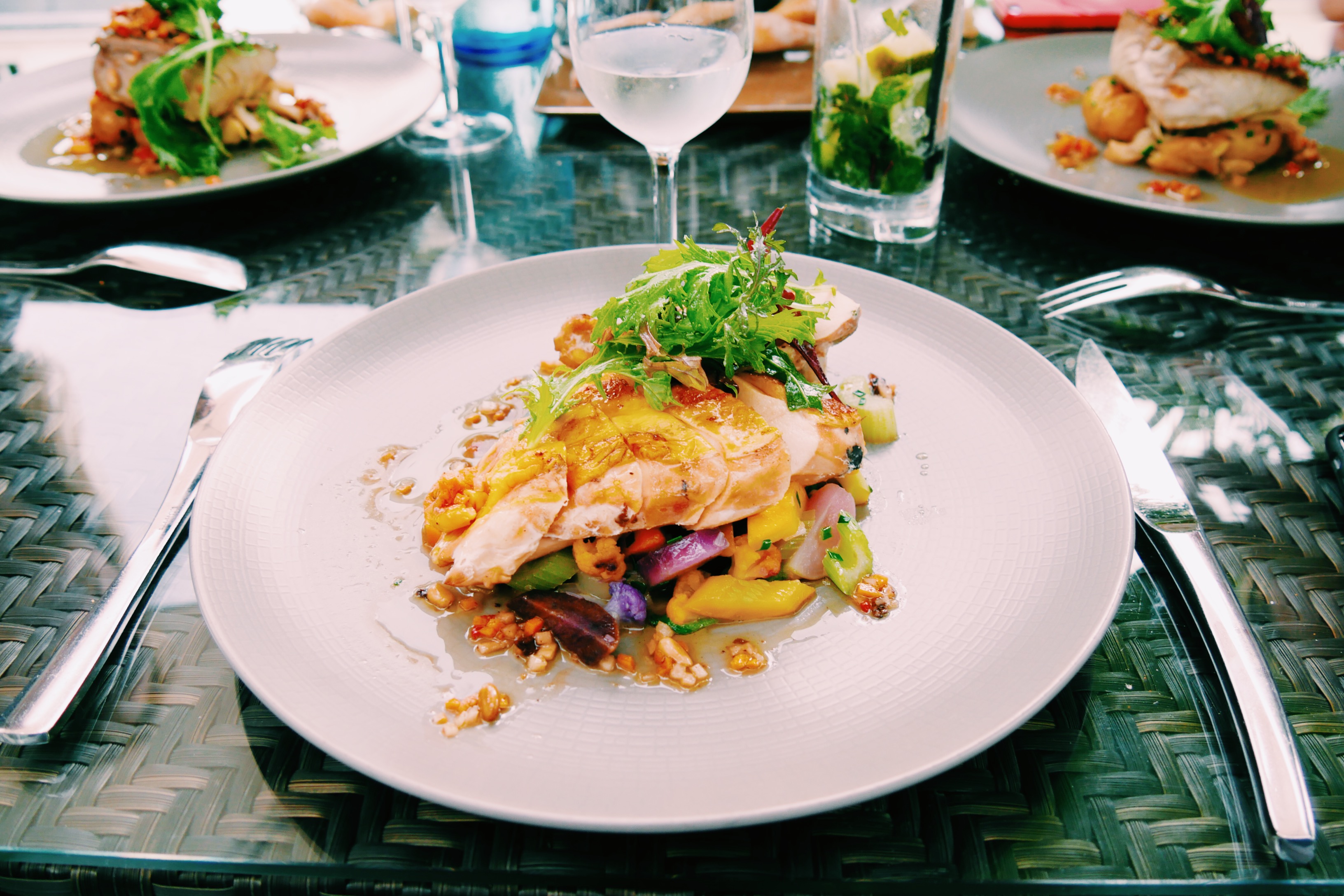 Suit le suprême de volaille fumé label rouge et légumes de saison. J’ai hésité quand même avec les gambas à la plancha, également proposées au menu avec leur risotto au pecorino affiné. Je ne regrette pas mon choix. Autre proposition, le plat du jour, une belle daurade, parfaitement cuite et accompagnée.