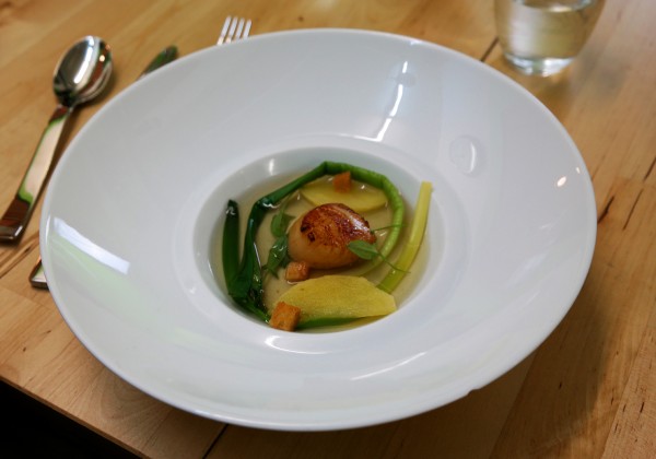 Saint-Jacques / Légumes d’hiver Rôties au beurre, les Saint-Jacques fondent dans la bouche. Le bouillon de légume rehaussé de gingembre et de citronnelle est léger. Navets et poireaux agrémentent parfaitement ce plat qui est une délicate mise en bouche.