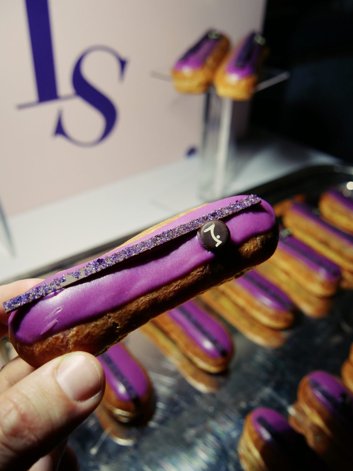 Une fine couche violette sur le dessus associée à une ligne graphique de chocolat avec touches sucrées pour rehausser une pâte à chou claire.