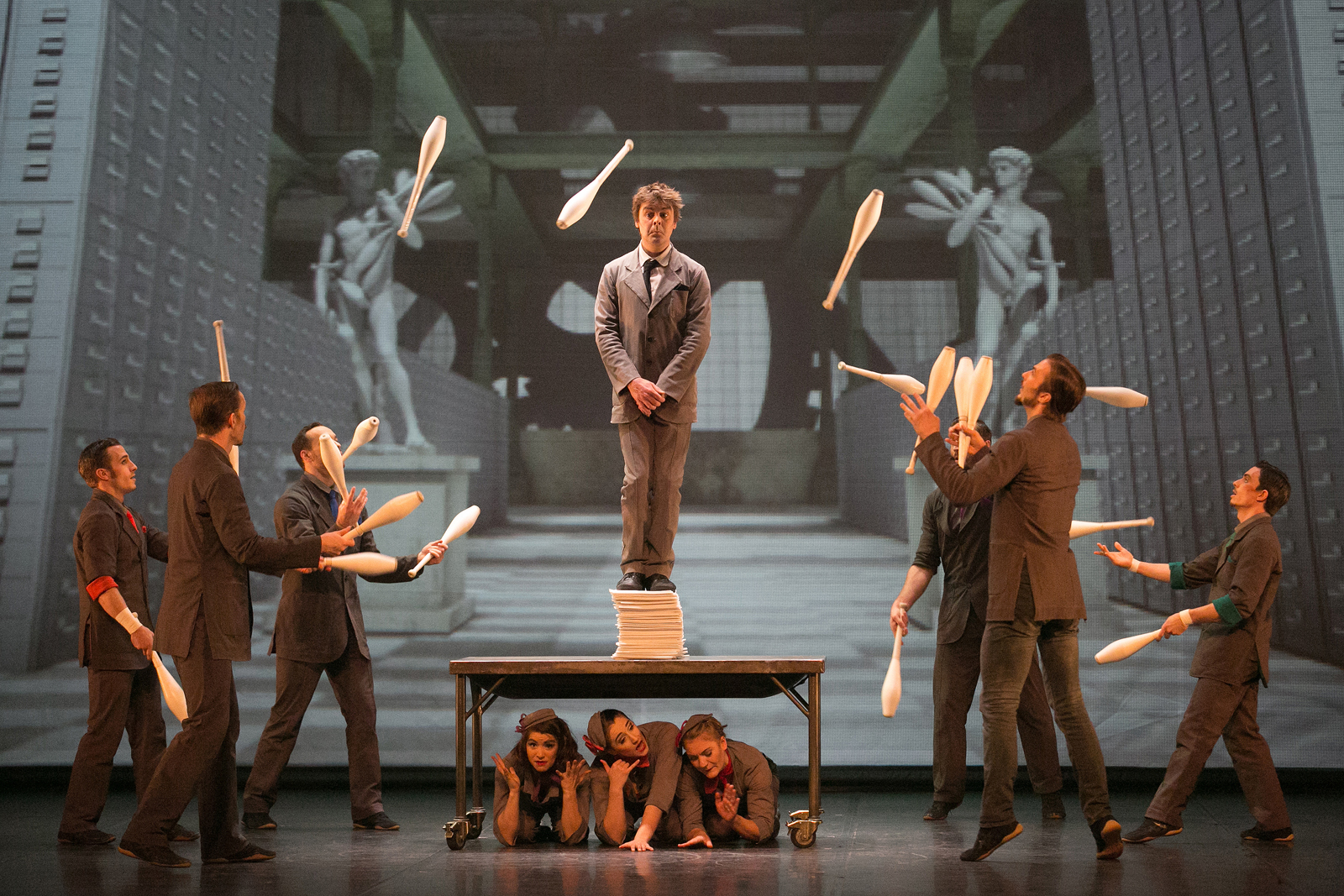 Le rideau s’ouvre sur un homme, assis à son bureau, avec en toile de fond des impressions 3D de gratte-ciels mornes et tristes. Cet homme sera le fil conducteur du spectacle inspiré du film Metropolis. S’anime alors autour de lui, tel un ballet administratif, une kyrielle de collègues austères, vêtus de gris.