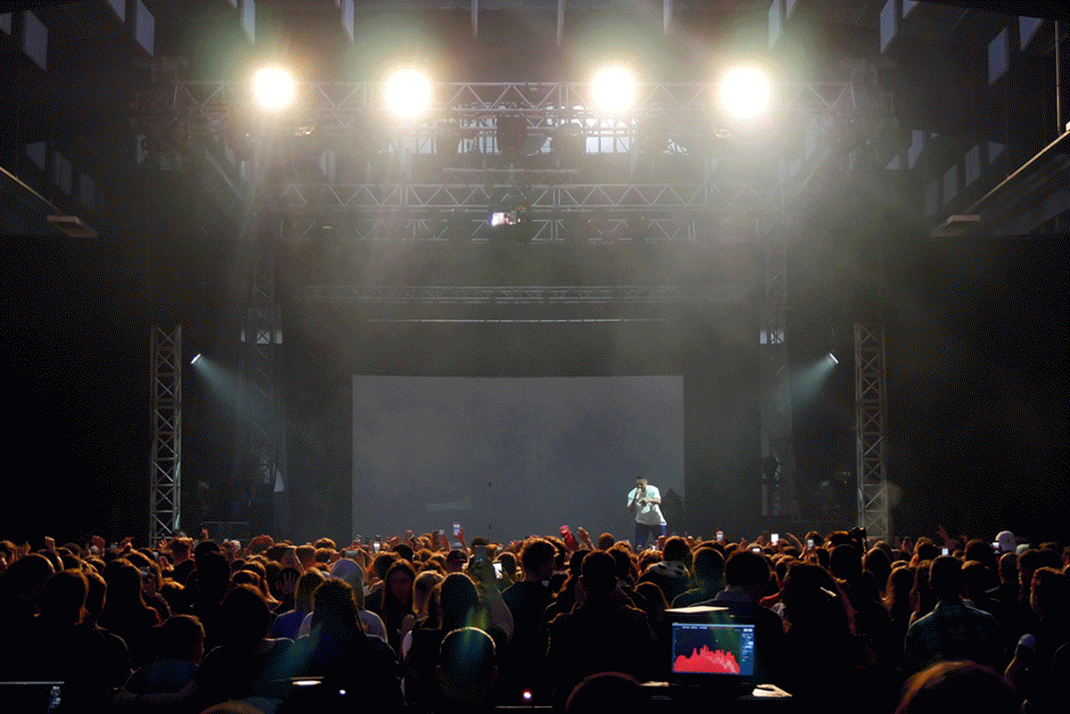 Le jeune rappeur saute sur un pied, puis l’autre, déchaîne les jeunes qui connaissent ses titres par cœur, Lolita...