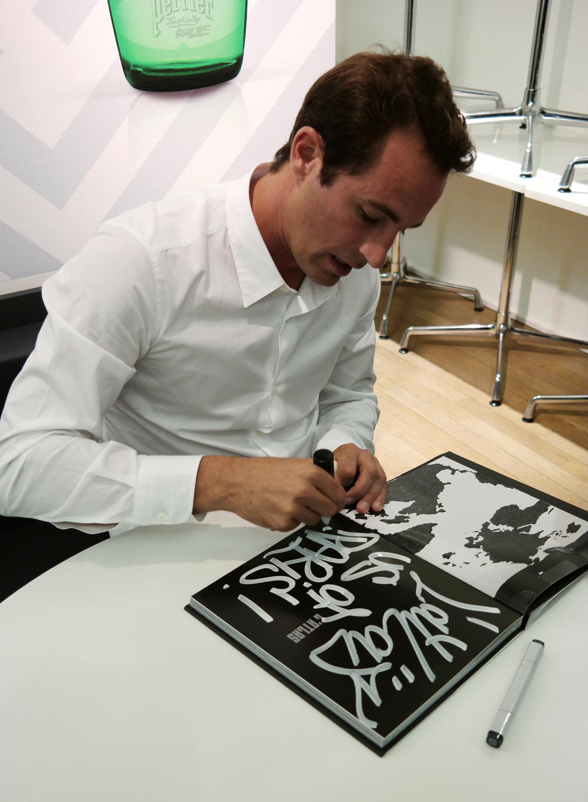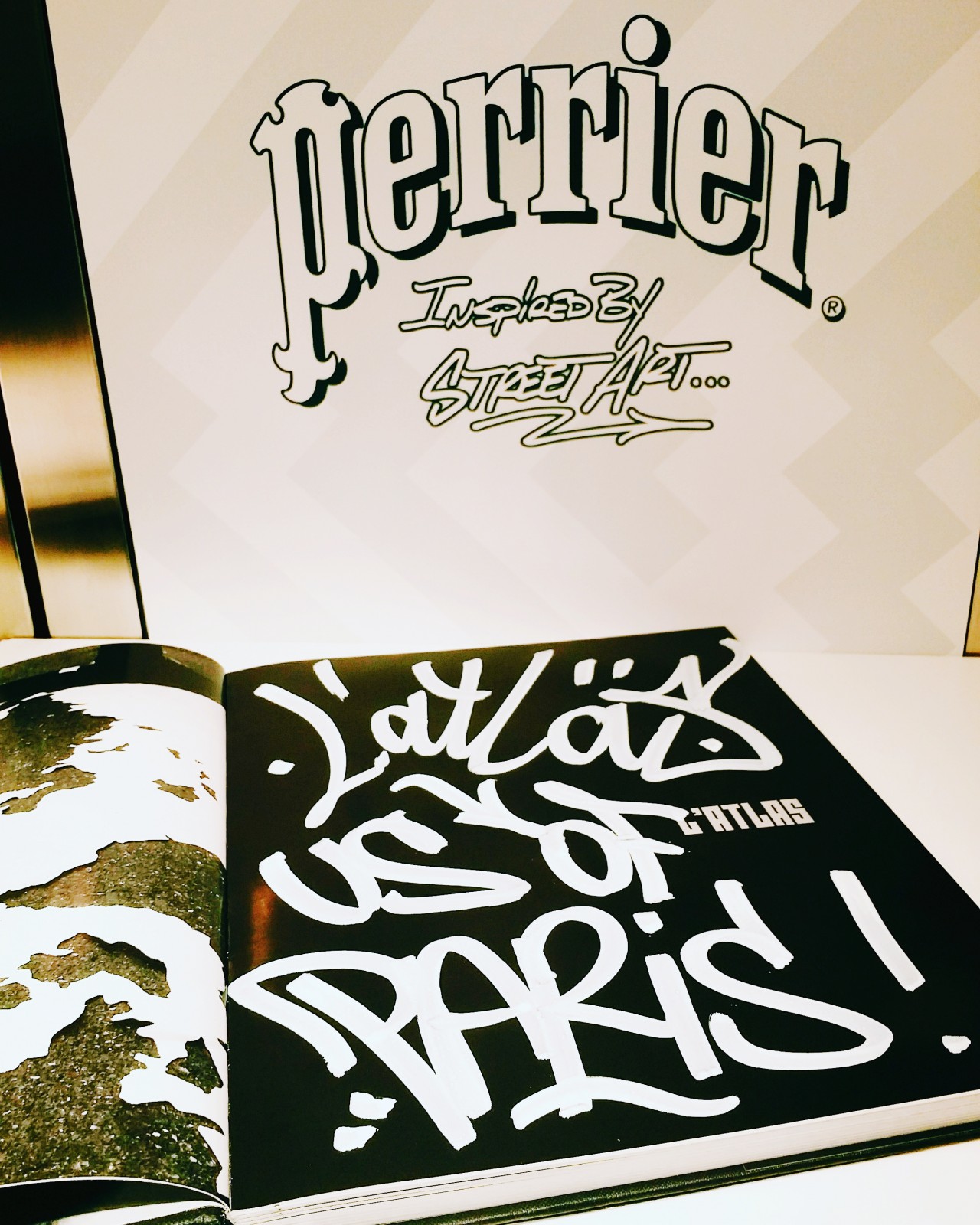 Le street-artiste L’Atlas a été choisi pour imaginer le packaging de la nouvelle édition limitée de Perrier : inspired by street art. Si l’édition 2014 a été créée à 6 mains par le Brésilien Eduardo Kobra, la Japonaise Sasu, et l’Américain JoOne, cette année, le Français L’Atlas est l’unique créateur de la série complète. Rencontre avec l’artiste lors de la soirée de lancement chez Colette.