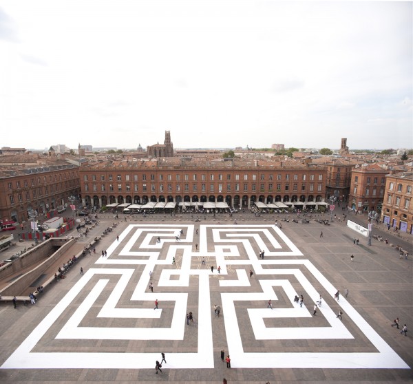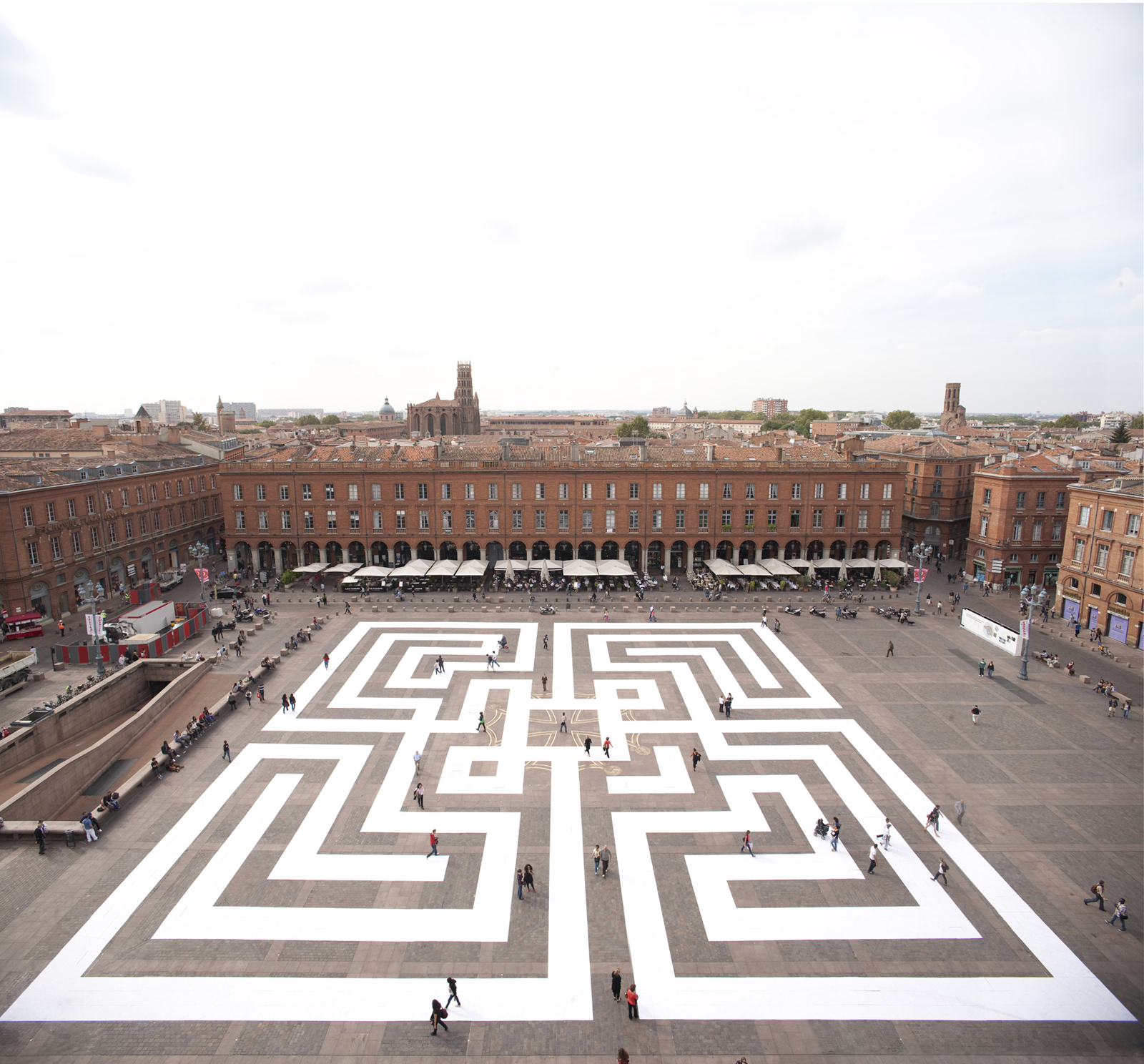 Toujours géométrique, sur toiles ou murs, son art devient spectaculaire quand il s’attaque à des espaces hors-normes. Sur une place ou lors de la résidence aux Bains Douches en 2013.