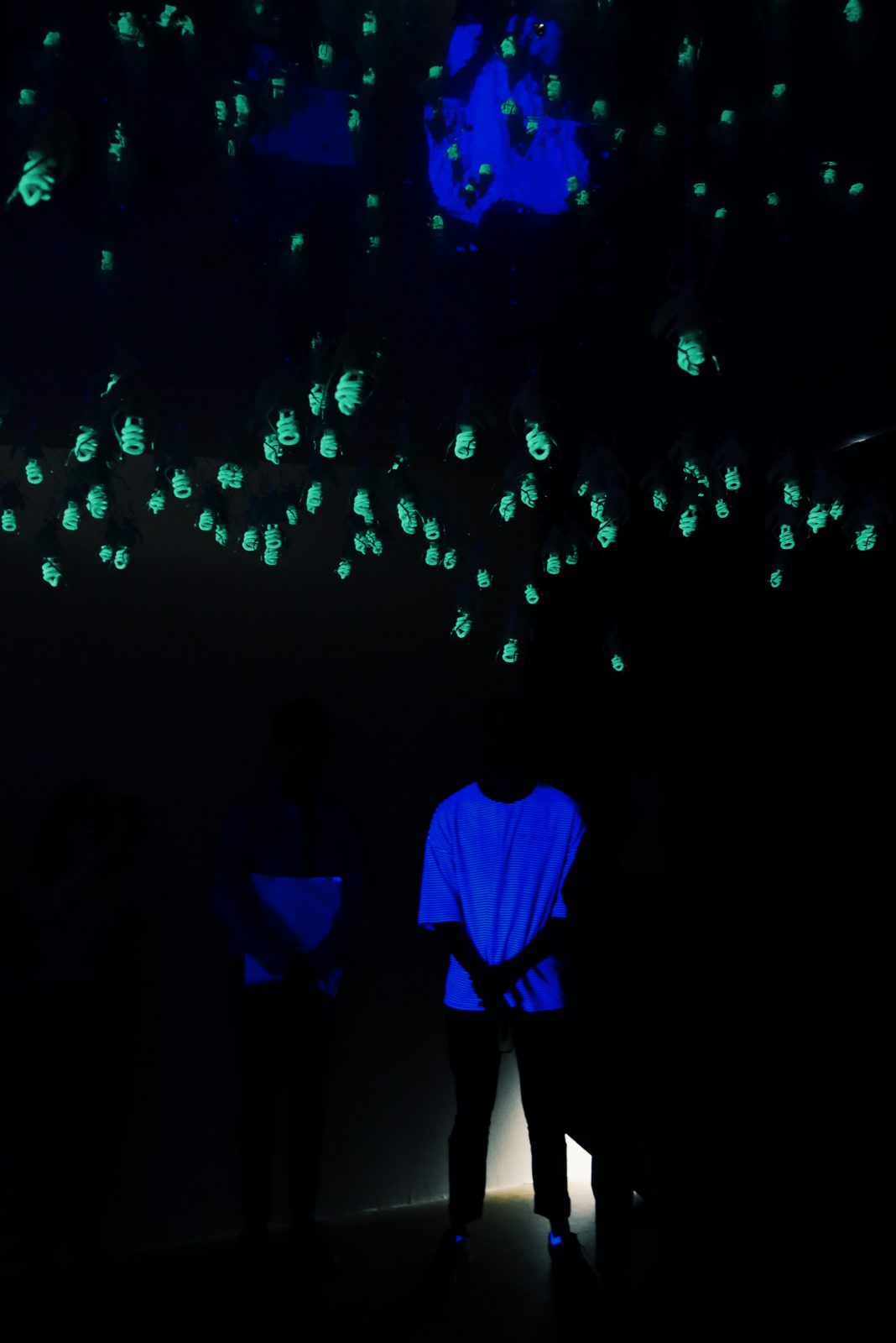 Au sous-sol, l’artiste a conçu une installation avec une armée de lucioles phosphorescentes, plongées dans le noir. L’idée lui est venue de Chine où certains villages ne sont pas éclairés de nuit. Il en a conçu un collage phosphorescent représentant une luciole.